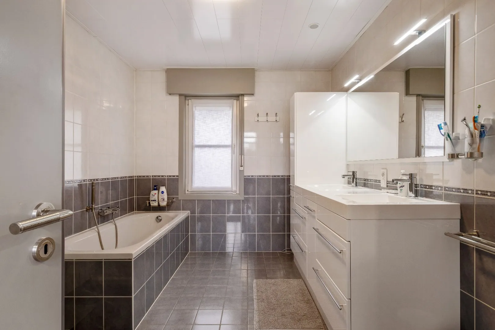 ✅ Badkamer met douche, ligbad, dubbele wastafel met meubel & spiegel