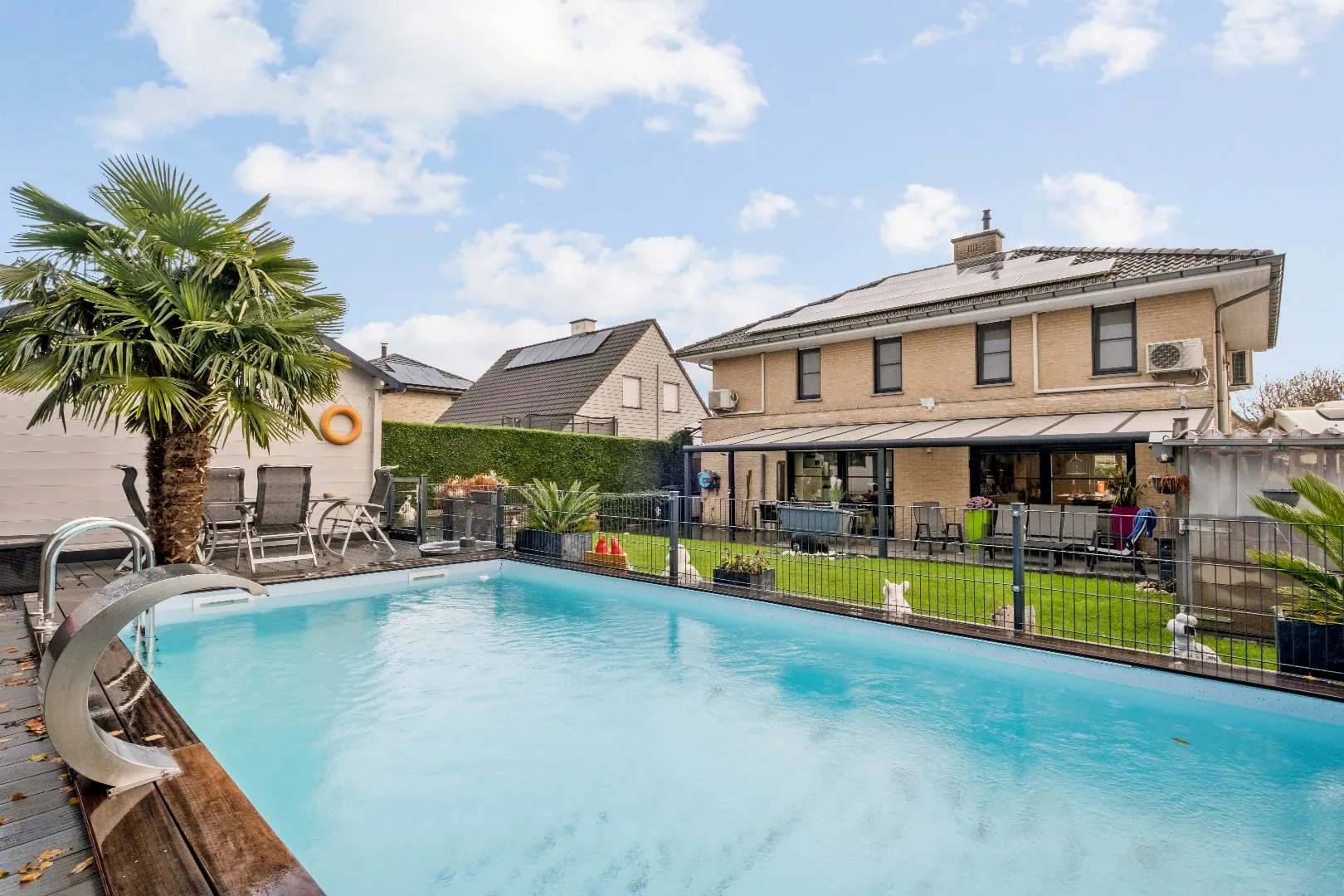 ✅ Nieuwe Liner in het zwembad met houten omranding en automatisch rolluik!