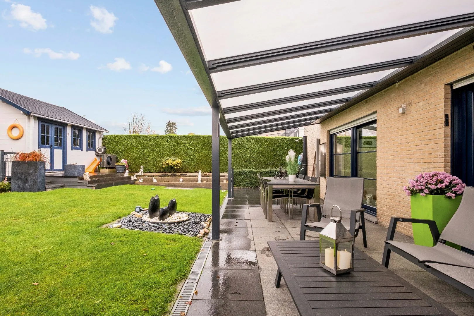 ✅ Zonnig aangelegd terras voorzien van overkapping, screens, elektriciteit en water