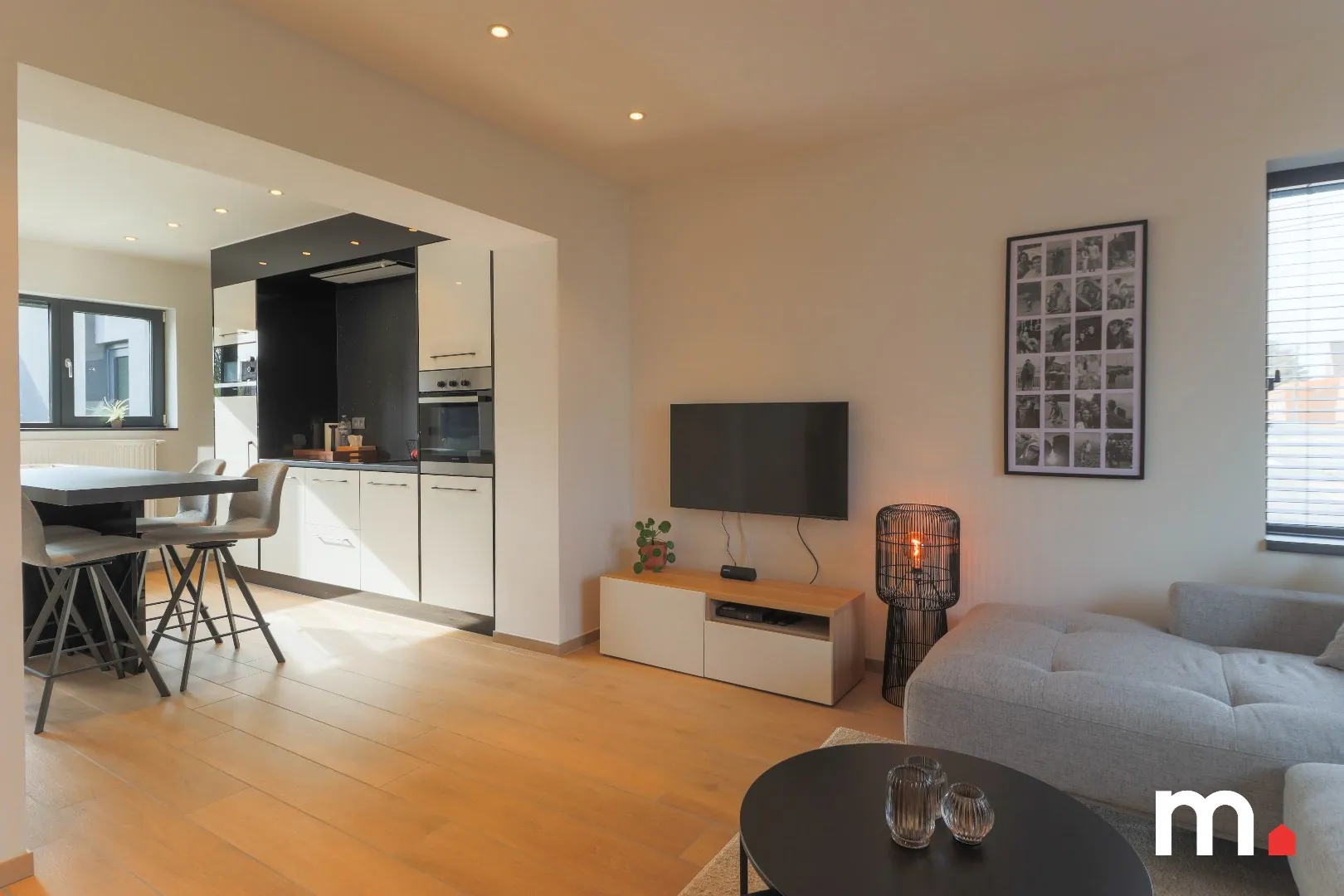 Binnenkomen in de gezellige leefruimte met open volledig ingerichte keuken voorzien van alle comfort en keukeneiland, de moderne ingerichte badkamer met luxe - bad en dubbele lavabo .De garage kan betreden worden via de deur langs de keuken en is reeds in die mate afgewerkt dat deze kan ingericht worden als bureel of praktijkruimte.