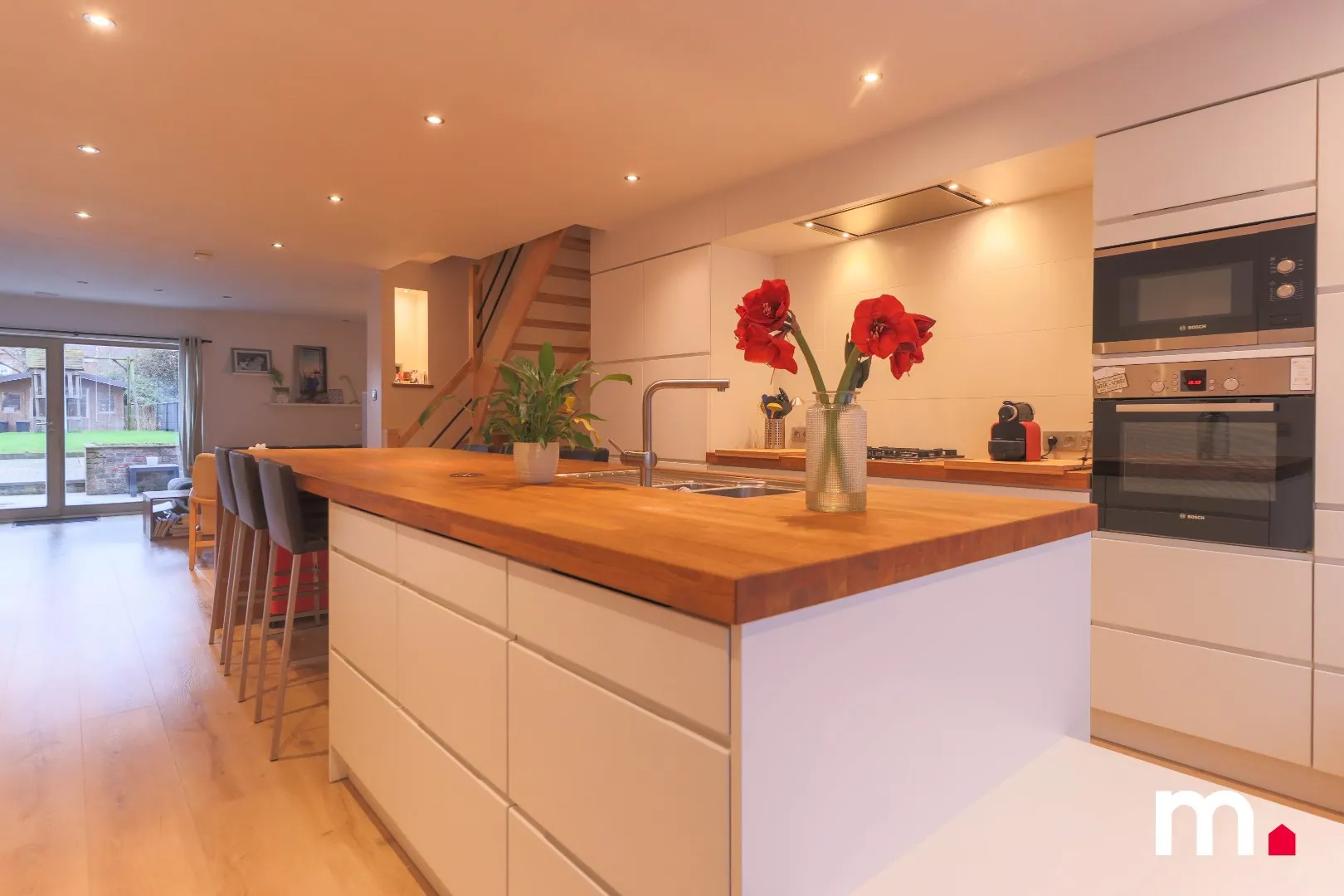 Bij binnenkomst komt u in een ruime inkomhal, die leidt naar een open keuken die volledig is uitgerust met alle moderne voorzieningen, waaronder een oven, inbouw vaatwasser, koken op gas, inbouw microgolfoven, inbouwfrigo en een dampkap. Het grote keukeneiland creëert een extra plek om te eten met 8 personen of te ontspannen, en de talrijke inbouwkasten zorgen voor voldoende opbergruimte.