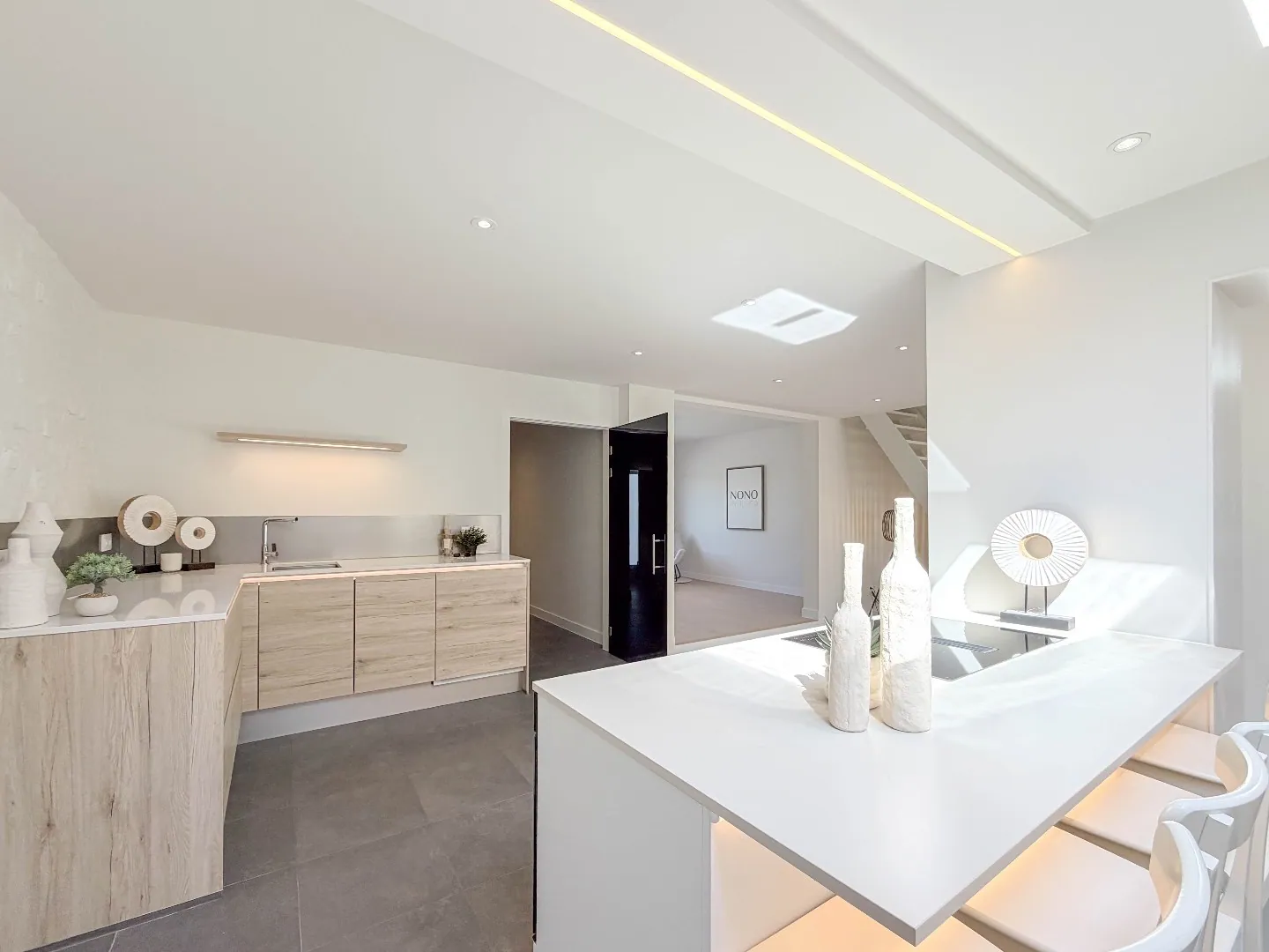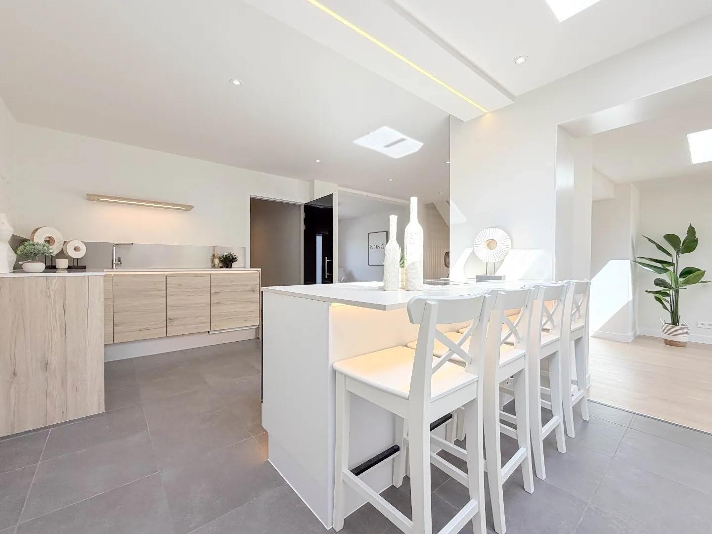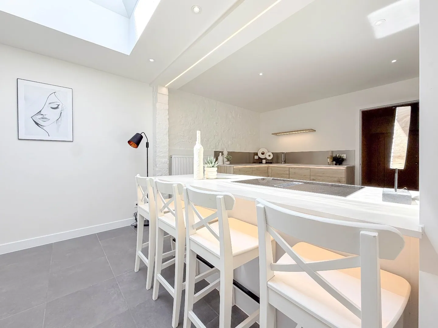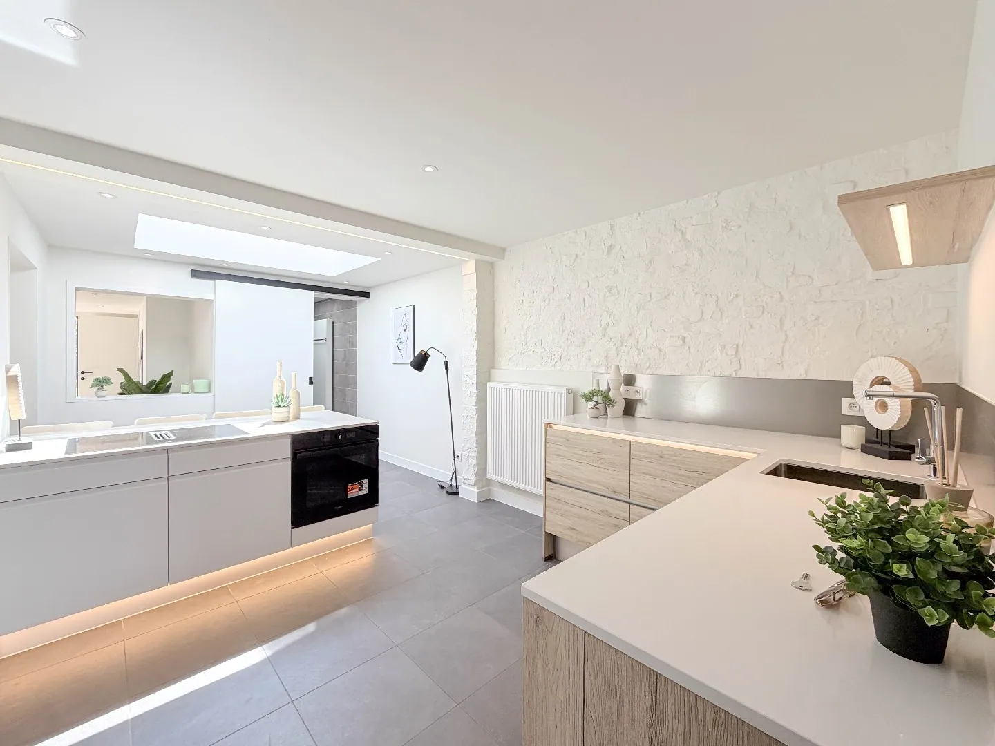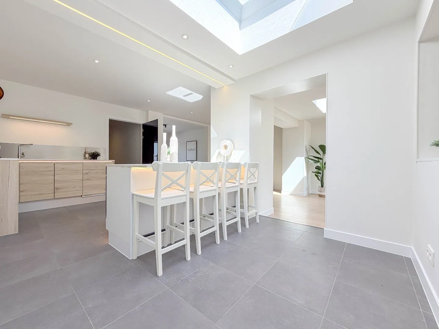 We komen binnen via de ruime inkomhal, met daarnaast een zeer ruime berging, ook ideaal voor fietsen ... verder komen we binnen in de zeer lichtrijke leefruimtes met een trendy keuken met ruime keukeneiland.