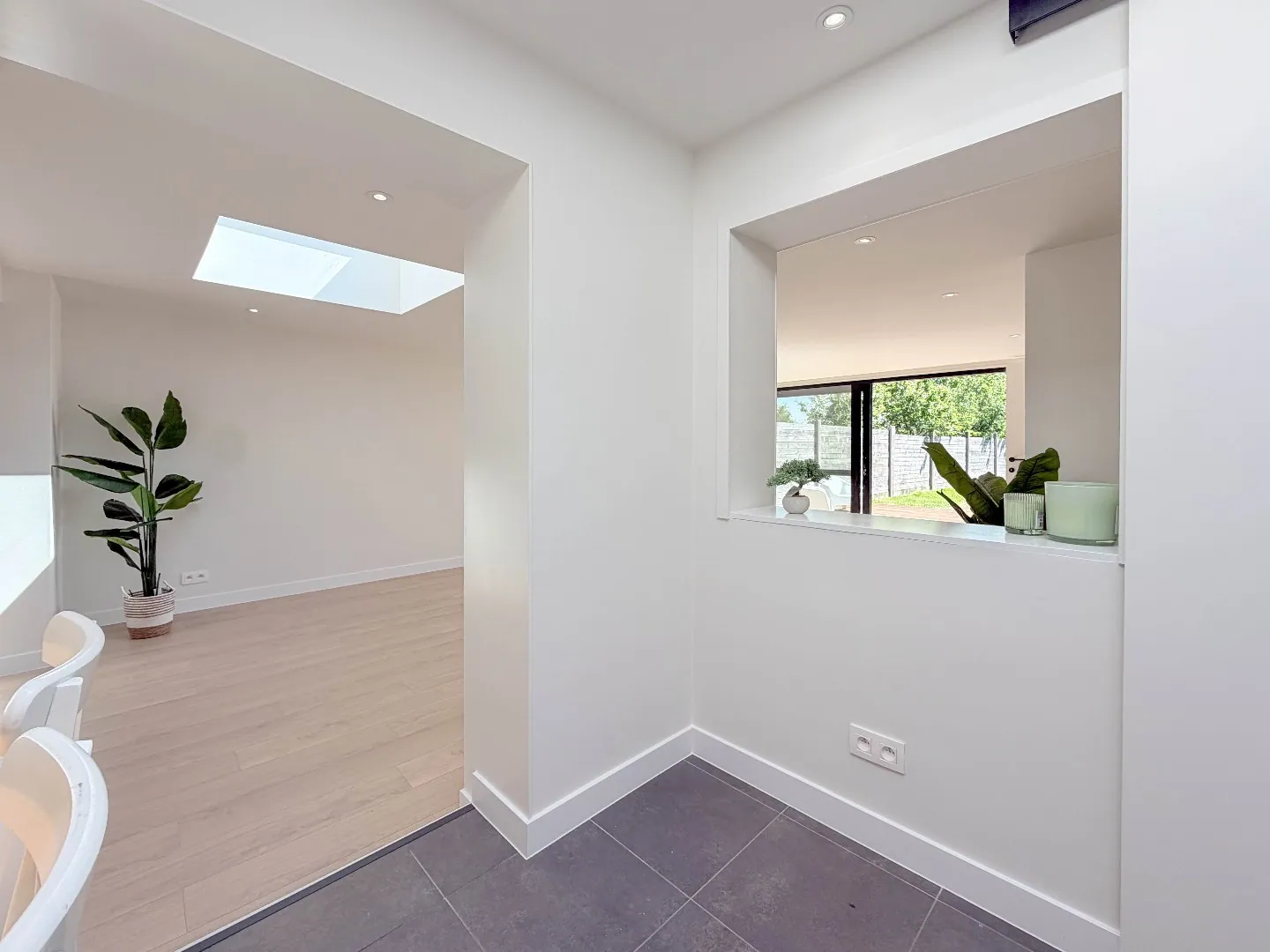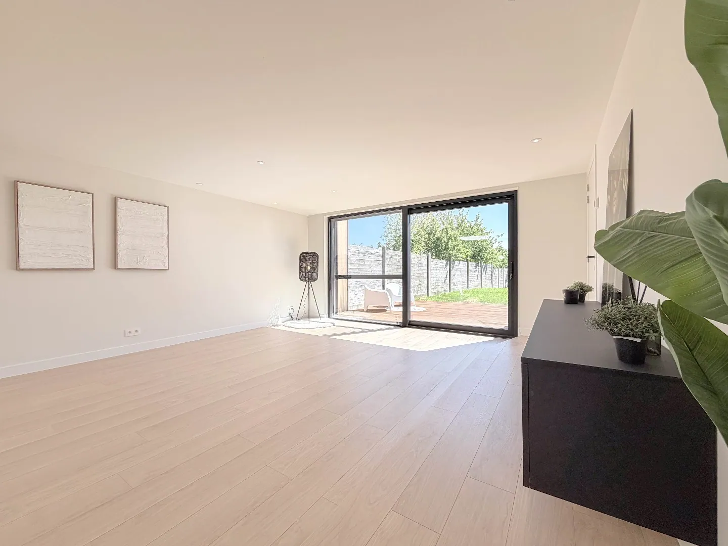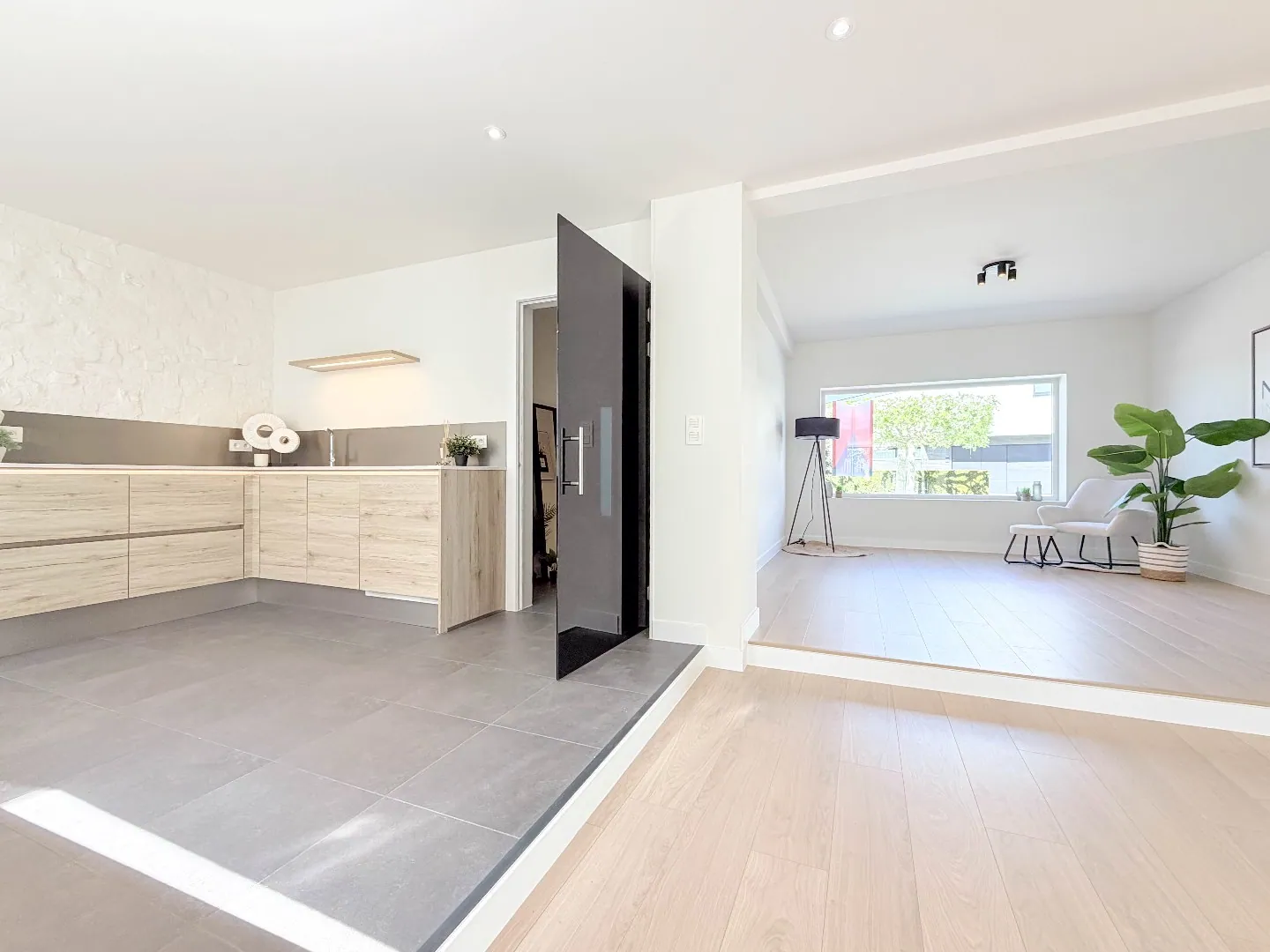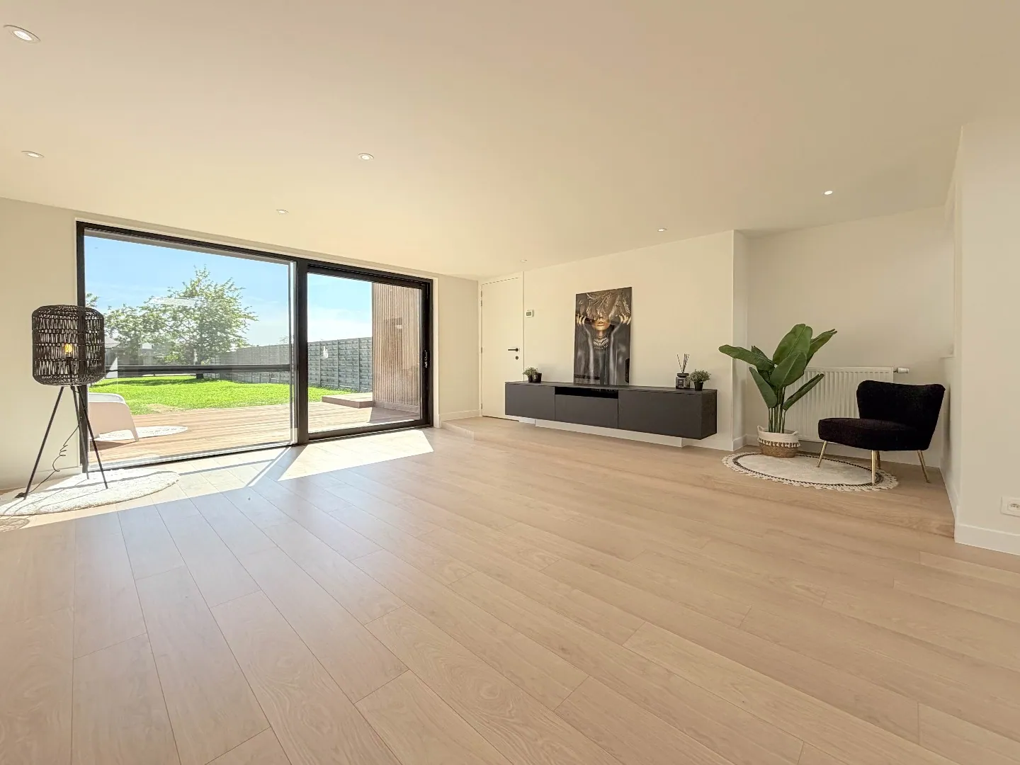 Vooraan een polyvalente grote ruimte met zicht vooraan, aan de andere kant een grote uitbouw met grote glaspartijen die zicht heeft op de zonnige tuin met een groot terras.