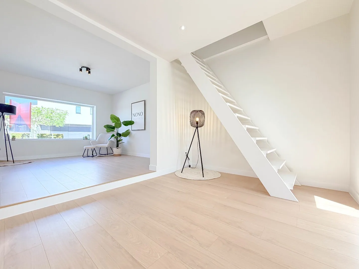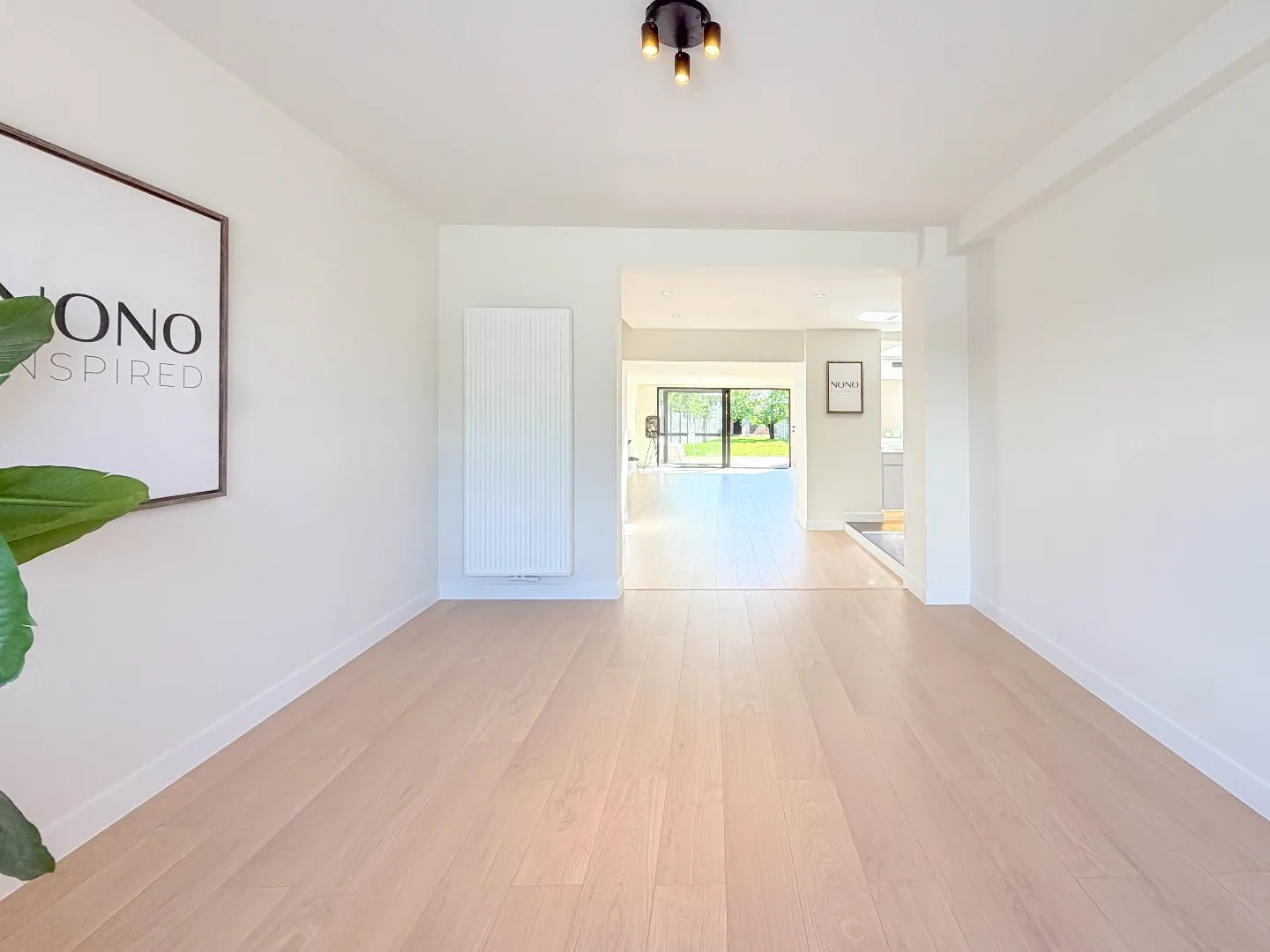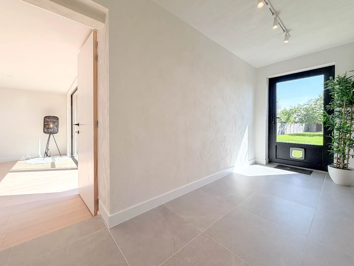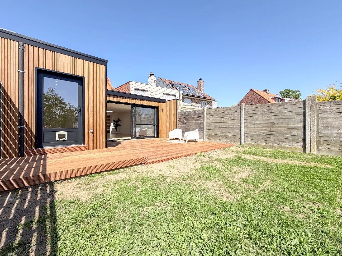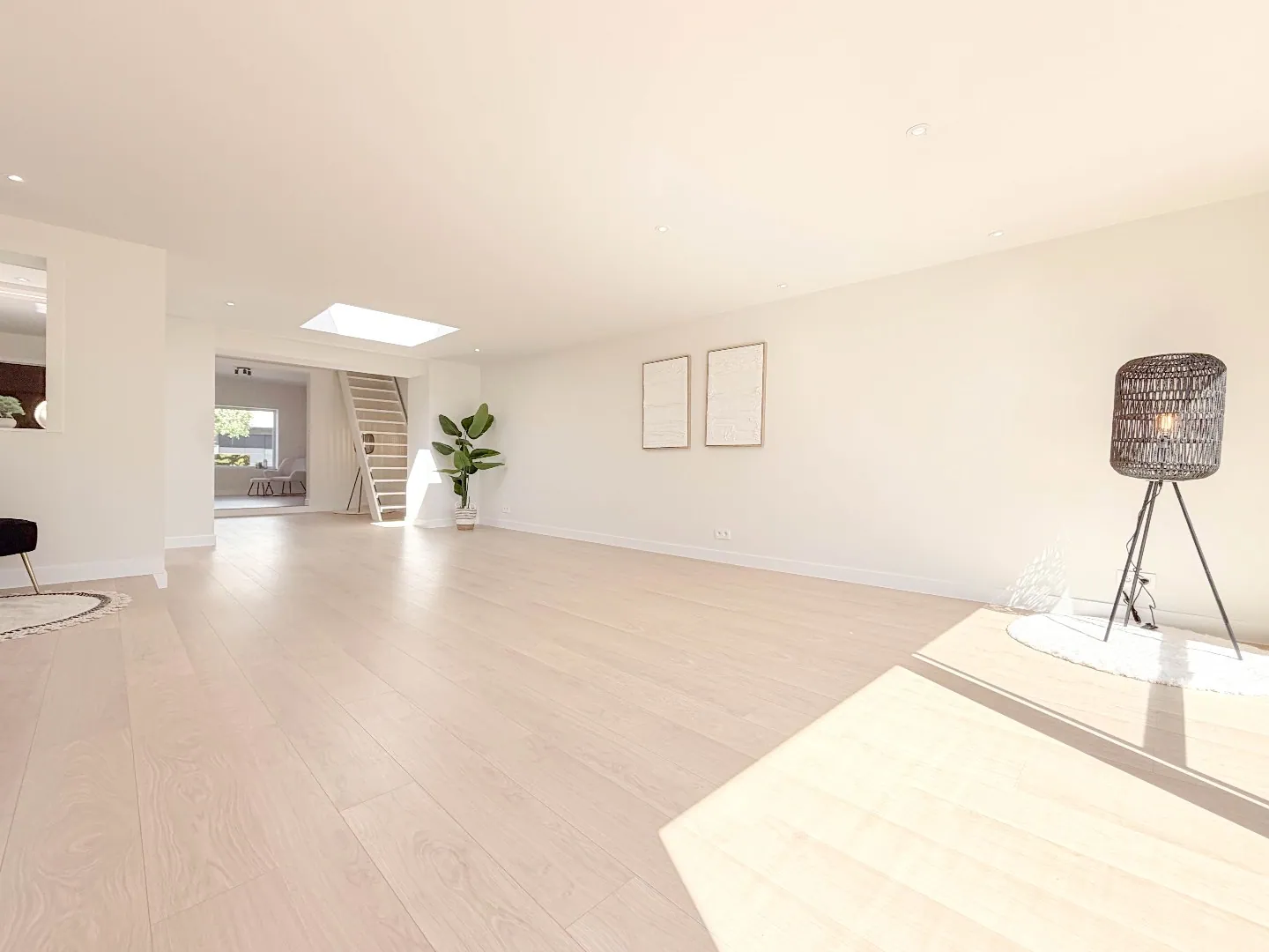 Vooraan een polyvalente grote ruimte met zicht vooraan, aan de andere kant een grote uitbouw met grote glaspartijen die zicht heeft op de zonnige tuin met een groot terras.