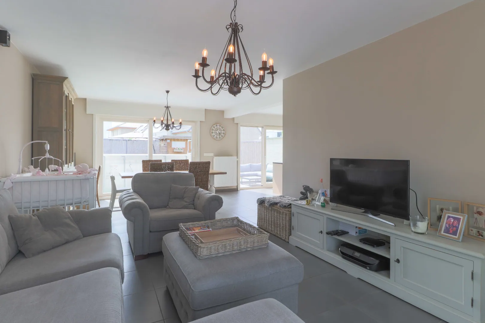 Een ruime lichtrijke leefruimte & volledig ingerichte keuken.