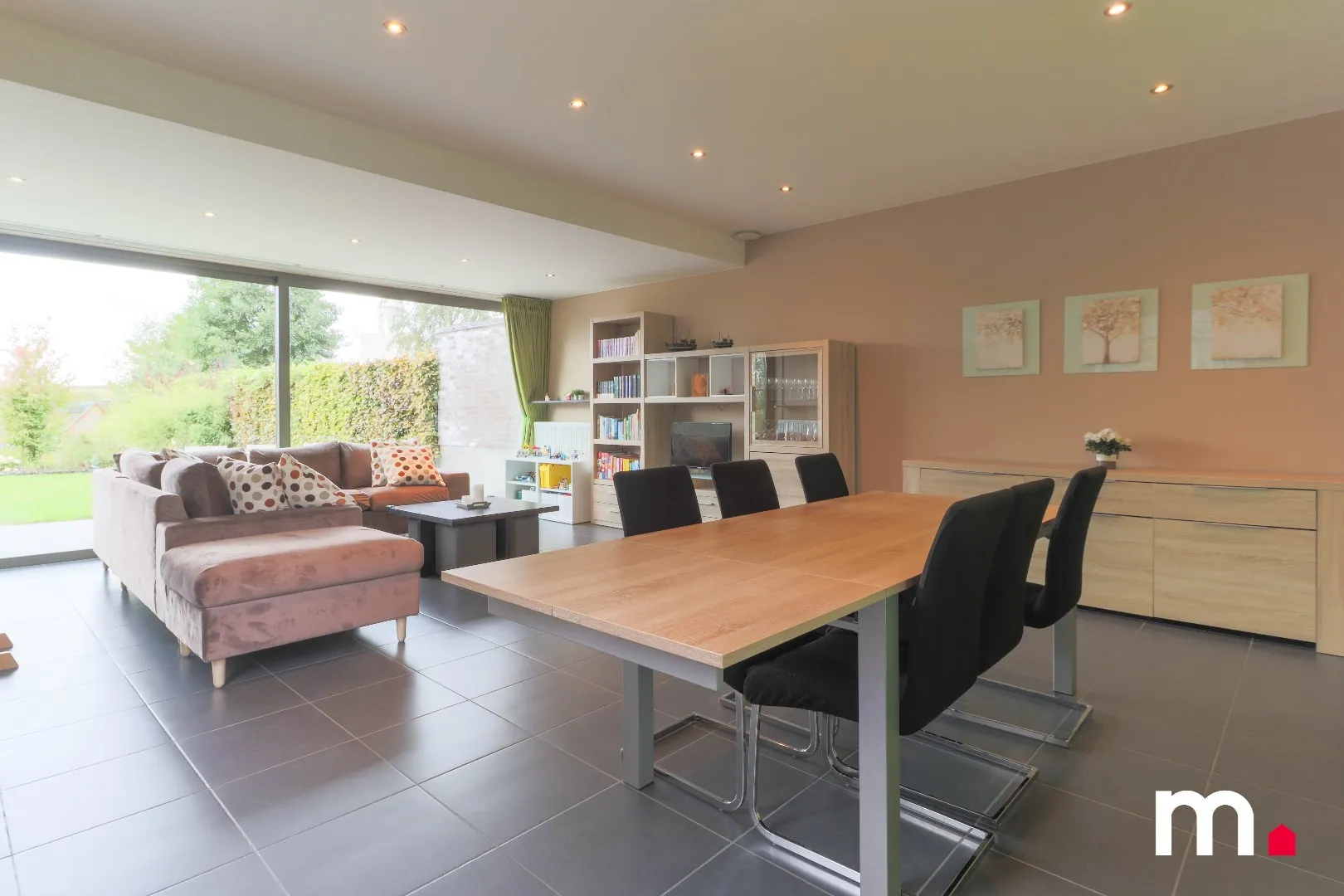 Aansluitend aan de keuken vindt u de lichtrijke leefruimte met een prachtig zicht op de zuid gerichte tuin. Deze tuin is aangelegd met oog voor detail en biedt een oase van rust en ontspanning een aangelegd terras en een wandelpad leiden naar het aangelegde 2de terras en ruime garage die zowel kan dienen als opbergplaats of als hobbyruimte met een directe toegang tot maar liefst 3 parkeerplaatsen.