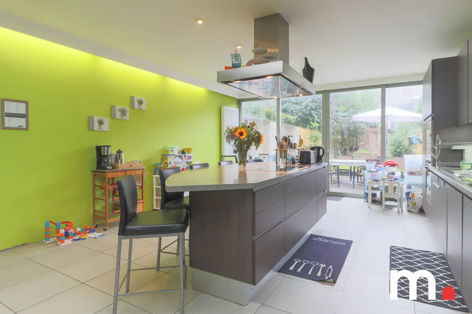 Op het gelijkvloers hebben we een zeer lichtrijke leefruimte met een open keuken die via een volledig open te schuiven raam aansluit op een gezellig terras en binnentuintje.