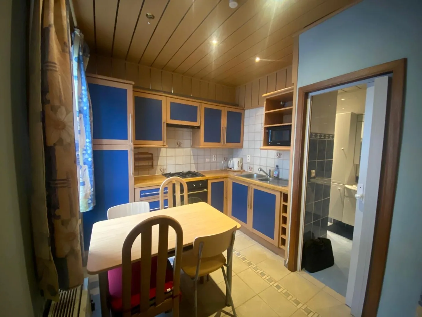op het gelijkvloers bevindt zich de keuken en de badkamer, op het eerste verdiep bevindt zich de woonruimte/slaapkamer, en op het tweede verdiep nog een slaapkamer.