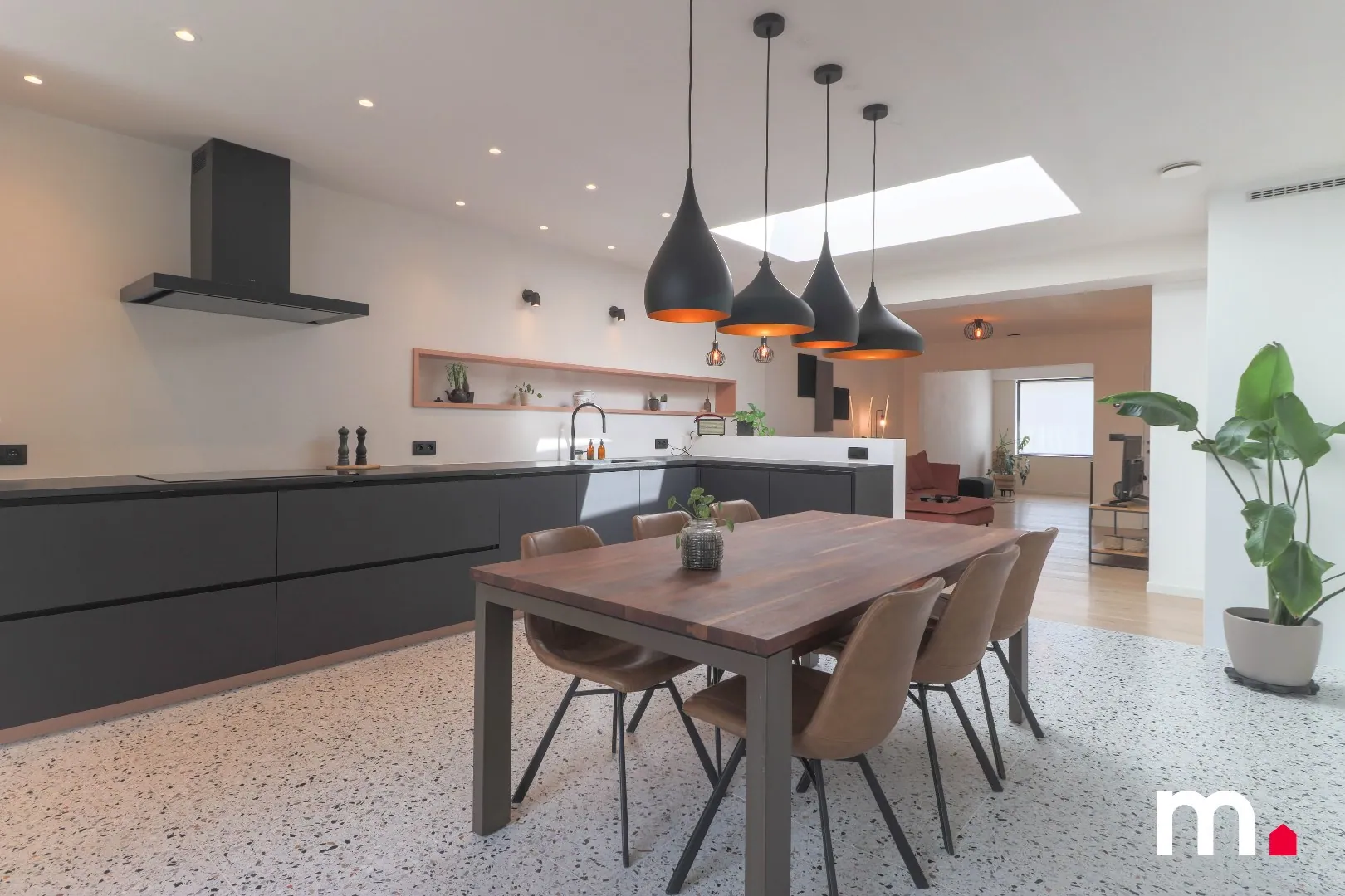 * Lichtrijke leefruimte met parketvloer, inbouwkasten en eetplaats met aansluitend open keuken