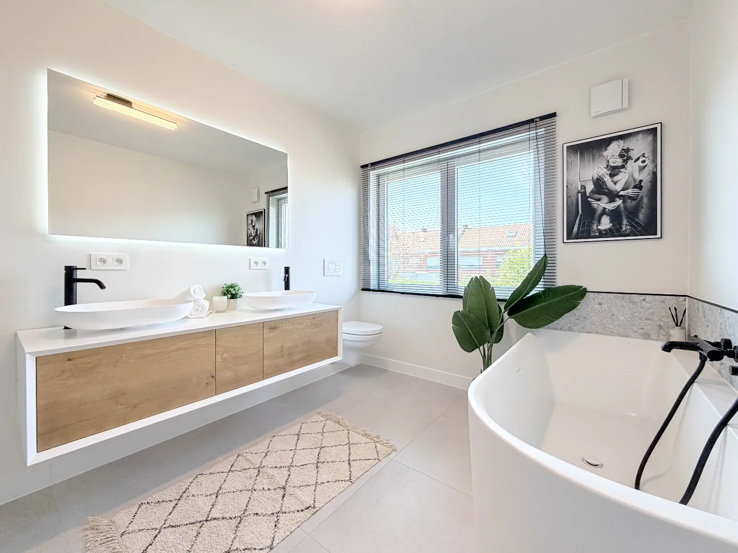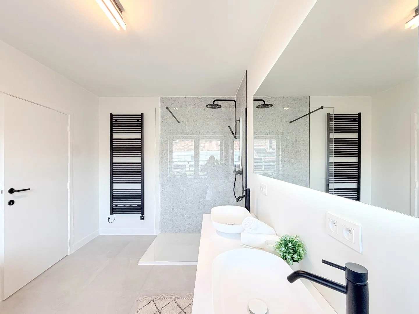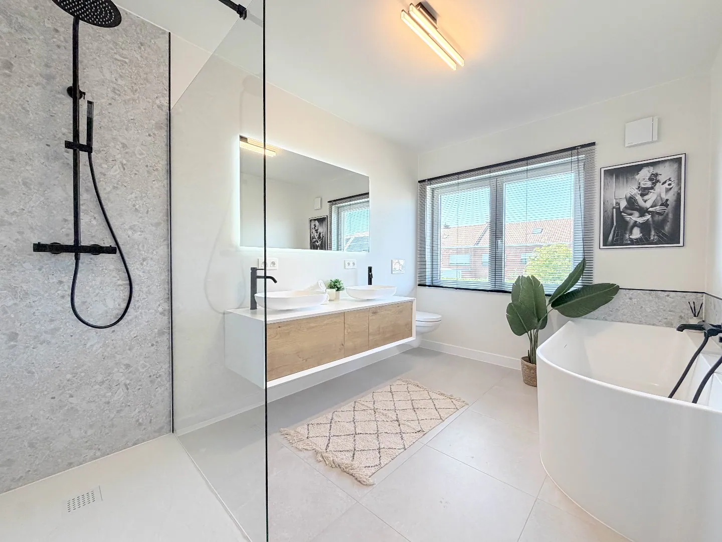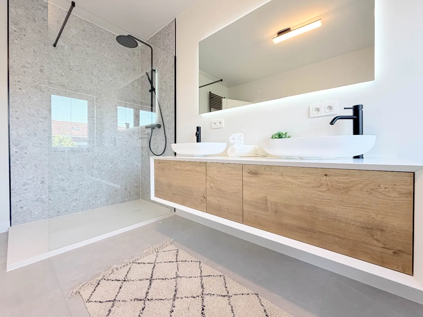 De luxueuze badkamer is uitgerust met een inloopdouche, ruim ligbad, dubbele lavabo met verlichte spiegel en een toilet, waardoor u elke dag in alle comfort kan starten of afsluiten.