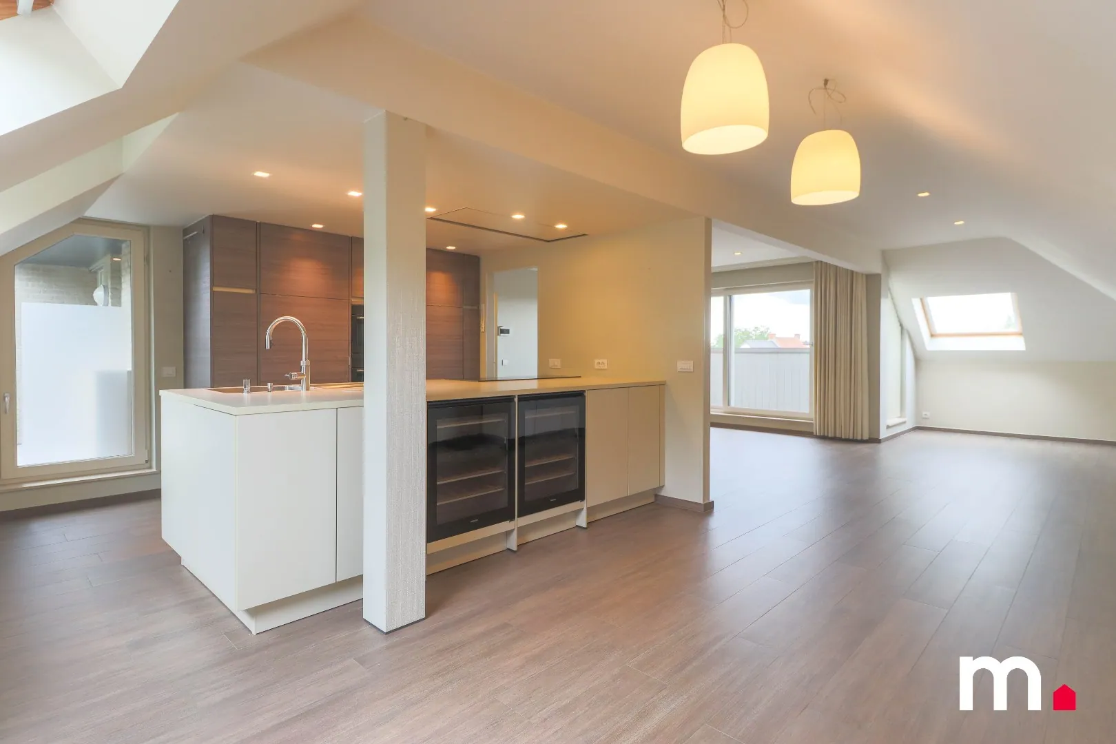 De ruime kwalitatieve keuken met wijnkoelers bevindt zich in de open lichtrijke leefruimte.