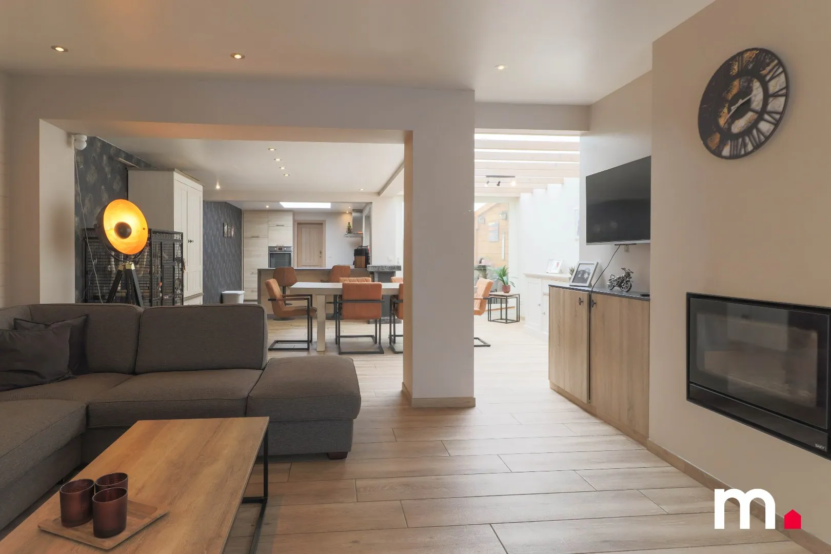 U komt binnen in de inkomhal. Via de inkomhal komt u terecht in de open leefruimte waar de lichtinval meteen opvalt. Er is voldoende plaats voor kasten en alsook is er een open haard aanwezig. De moderne keuken met keukeneiland is voorzien van alle nodige comfort. Aansluitend is er een zeer praktische berging.