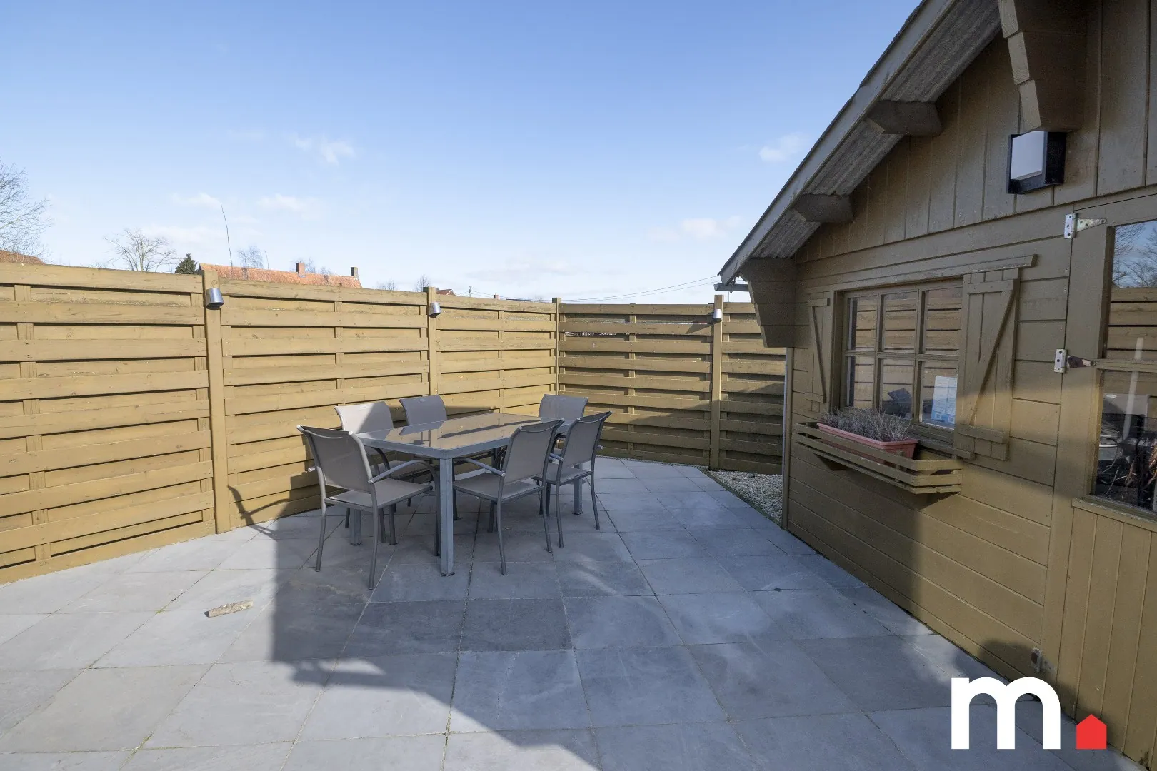 Achteraan komen we helemaal tot rust in de zonnige, onderhoudsvriendelijke tuin met kunstgras — een ideale plek om te ontspannen en te genieten van het buitenleven.