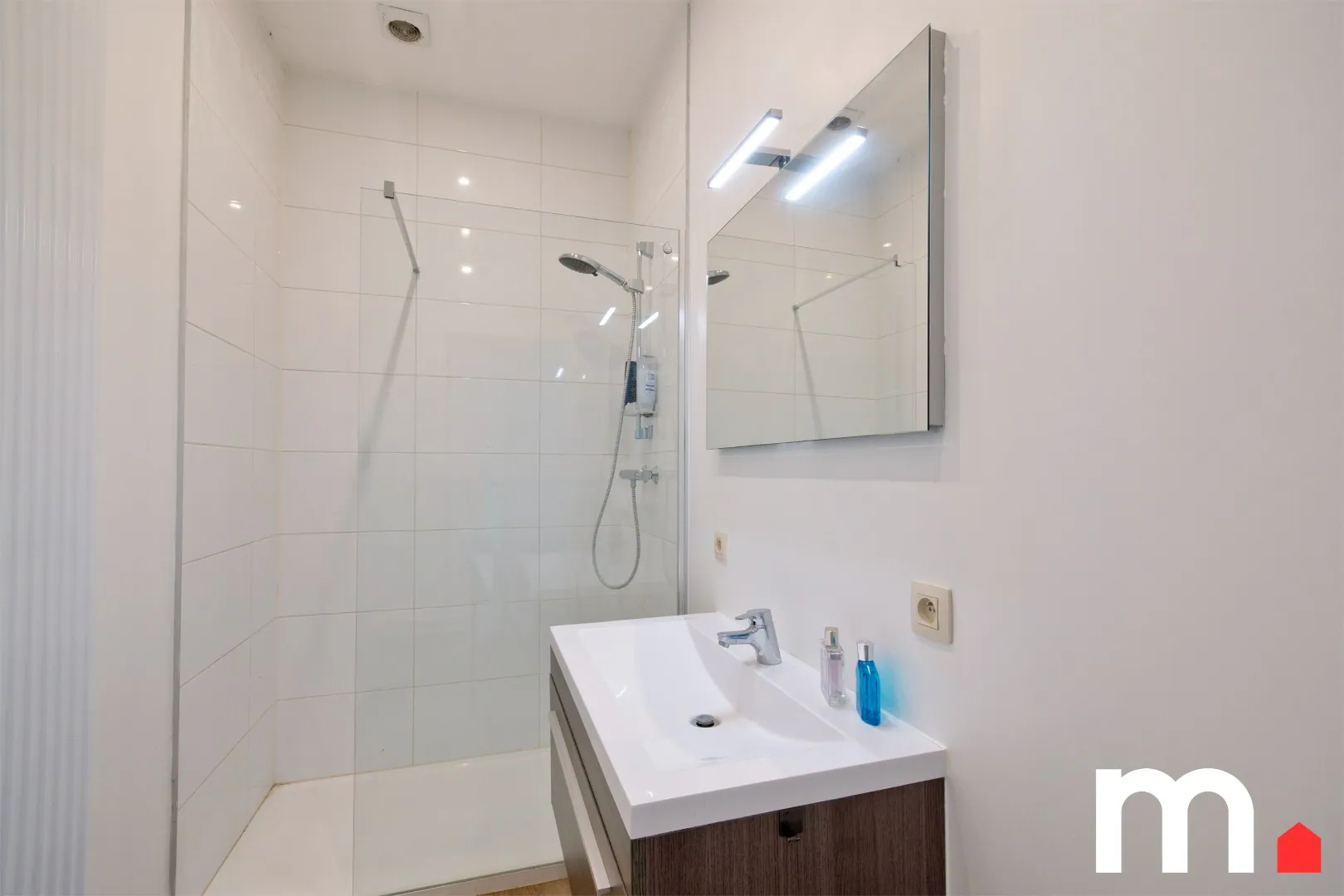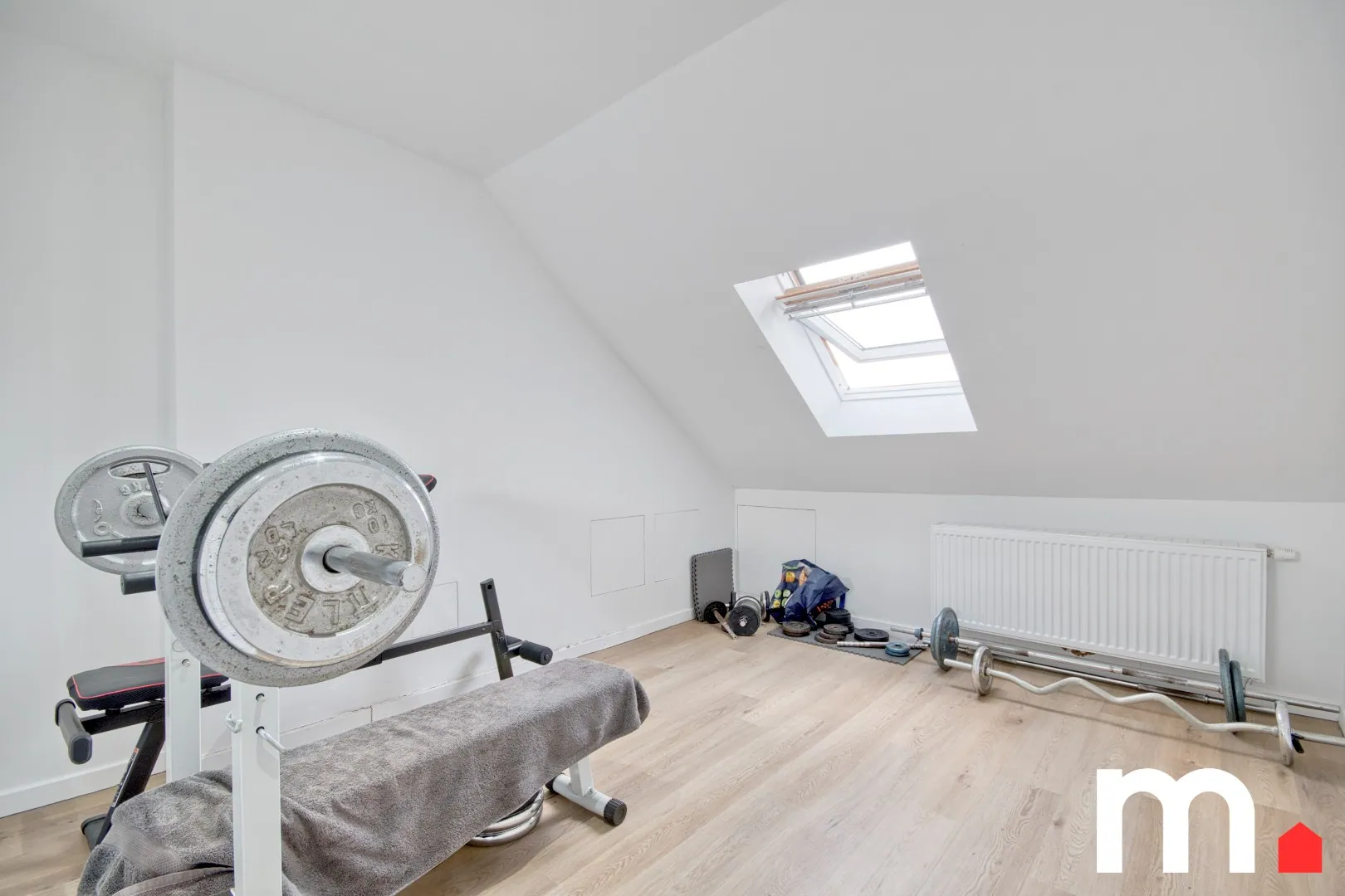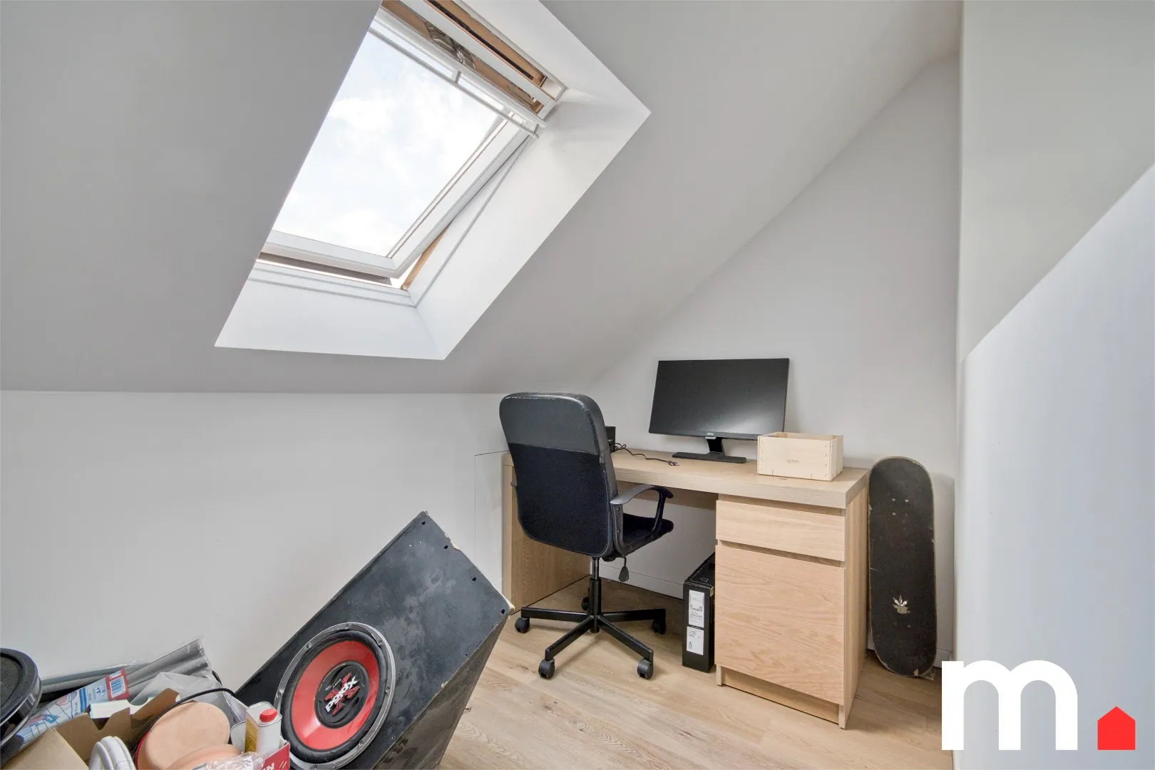 Op de eerste verdieping bevinden zich twee volwaardige slaapkamers en een moderne badkamer met inloopdouche, lavabo en toilet. Via een vaste trap bereik je de zolderverdieping, waar een derde slaapkamer werd ingericht.
