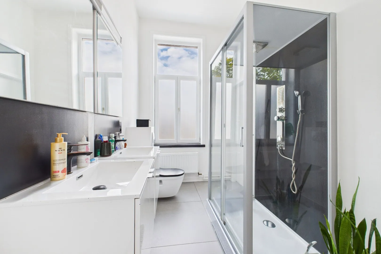 De tweede verdieping herbergt twee ruime slaapkamers met hoge plafonds en een stijlvolle badkamer met inloopdouche, dubbele wastafel met opbergruimte en toilet.