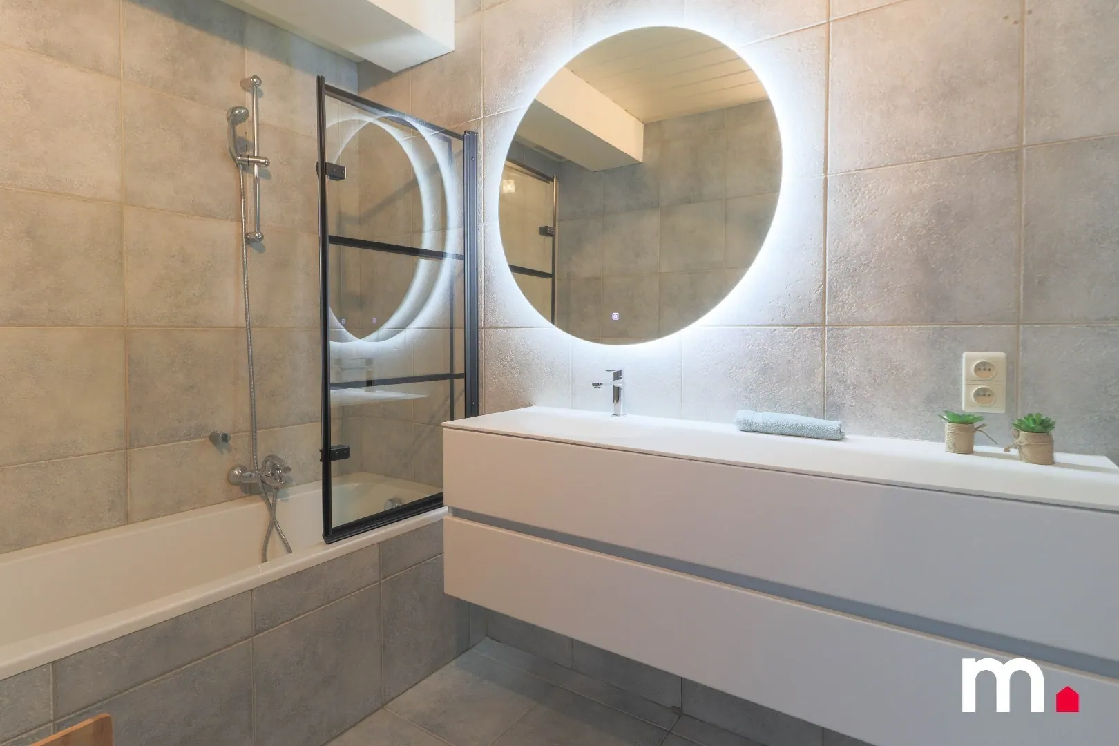 Het appartement heeft een aangename leefruimte met veel lichtinval met eetplaats en open keuken en een moderne badkamer met bad/douche en lavabo met meubel en spiegel