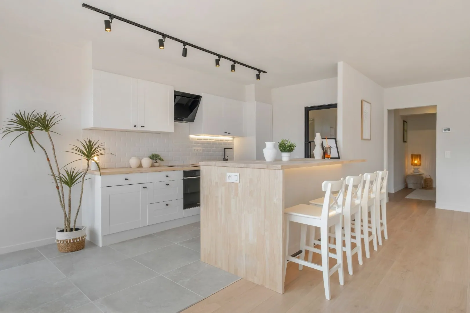Via de inkomhal komt u terecht in de riante living met heel veel lichtinval. Deze ruimte is voorzien van een volledig uitgeruste open keuken met alle comfort (Kookplaat, frigo met diepvries, spoelbak, dampkap, vaatwasmachine en heel wat kastruimte). Aansluitend is er de handige berging.