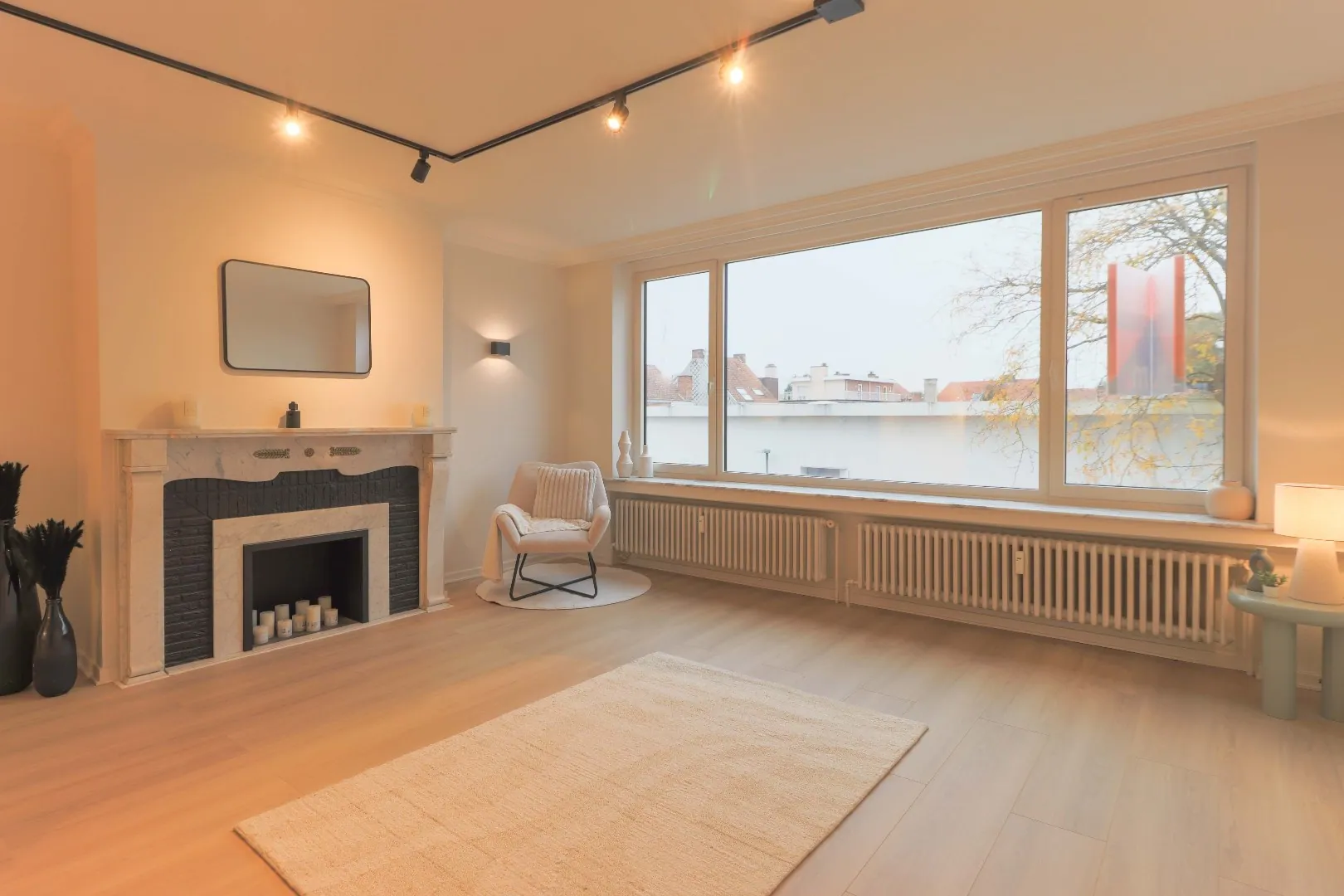 Aangename eerste indruk bij het binnenkomen in de ruime inkomhal, de leefruimte is voorzien van een mooie sierhaard als eyecatcher, de grote raampartijen zorgen voor veel lichtinval.