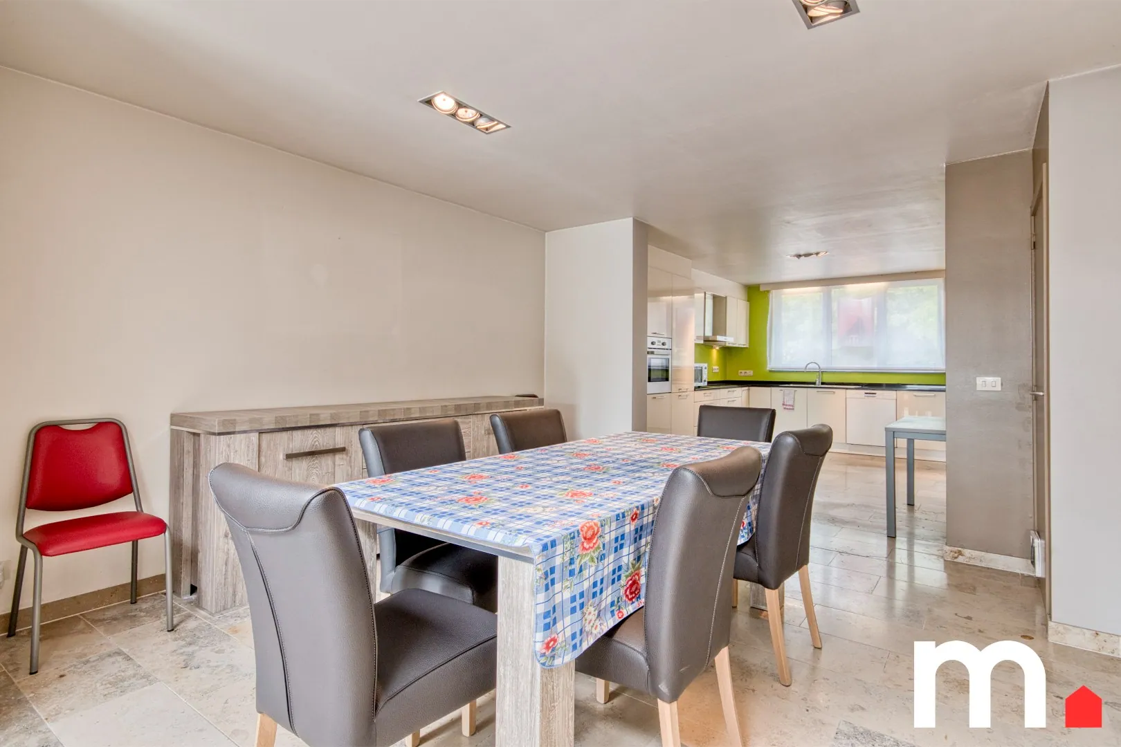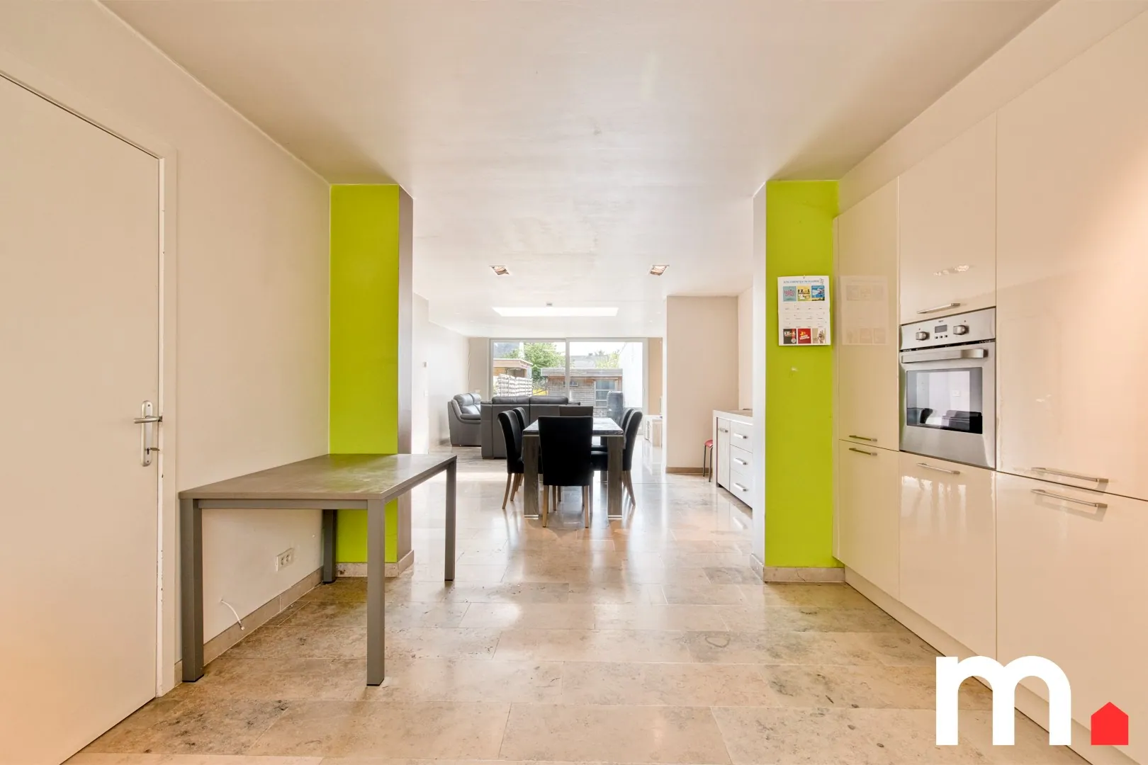 U komt binnen in een ruime en lichtrijke leefruimte, ideaal voor gezellige familiemomenten of om gasten te ontvangen. De moderne volledge uitgeruste open keuken staat in verbinding met de leefruimte. Dankzij het grote schuifraam heeft u rechtstreeks toegang tot het zonnige terras en het onderhoudsvriendelijke tuin.