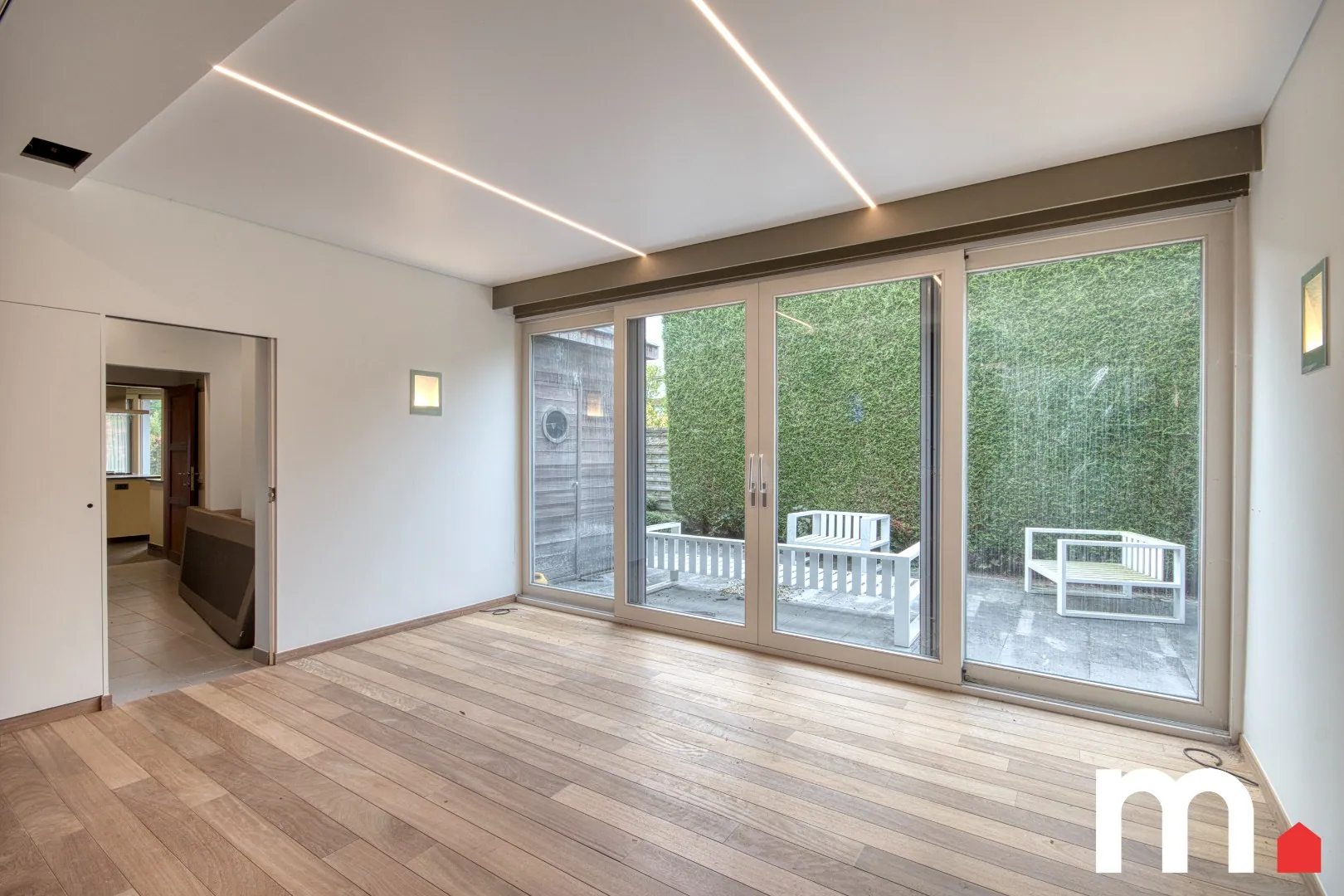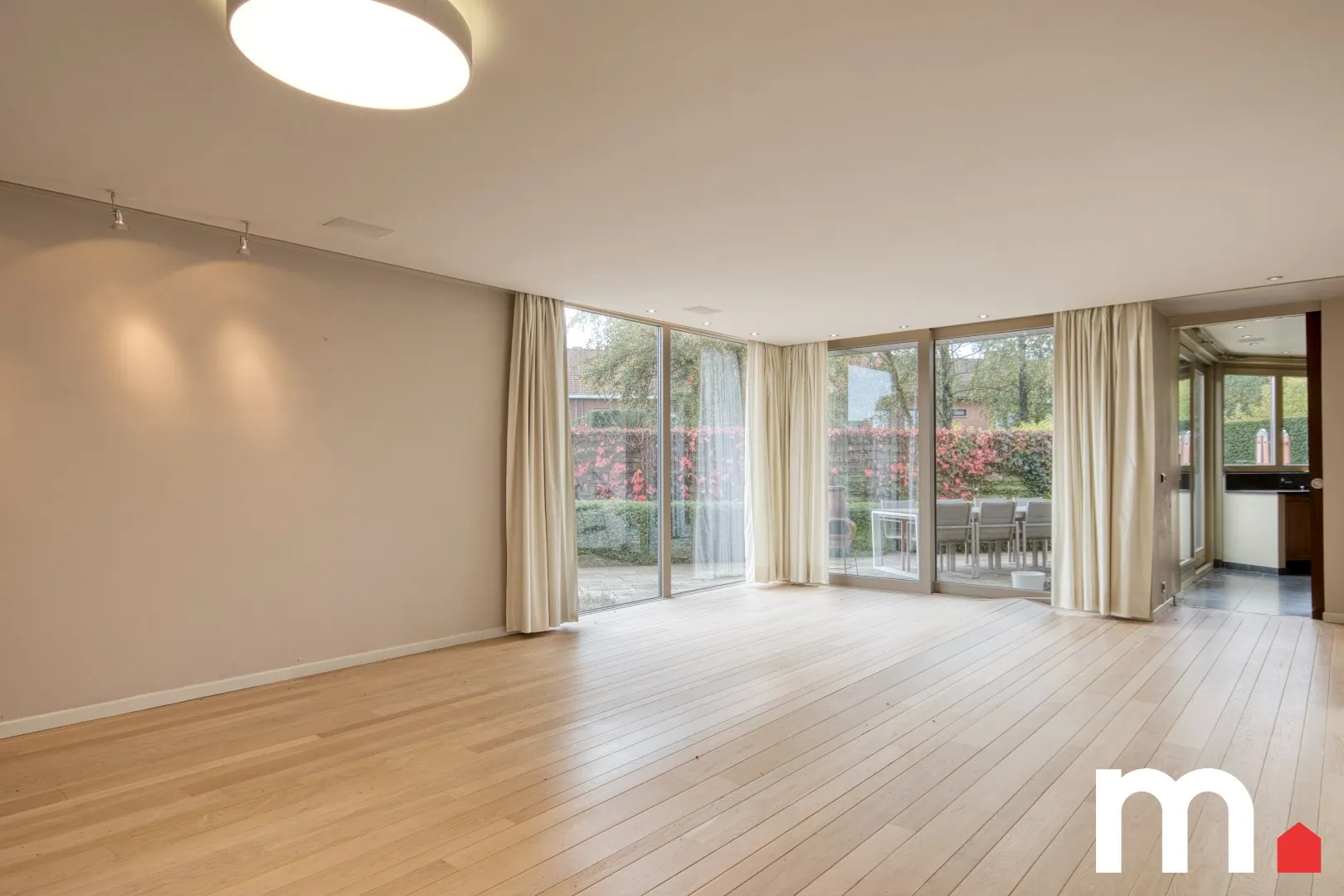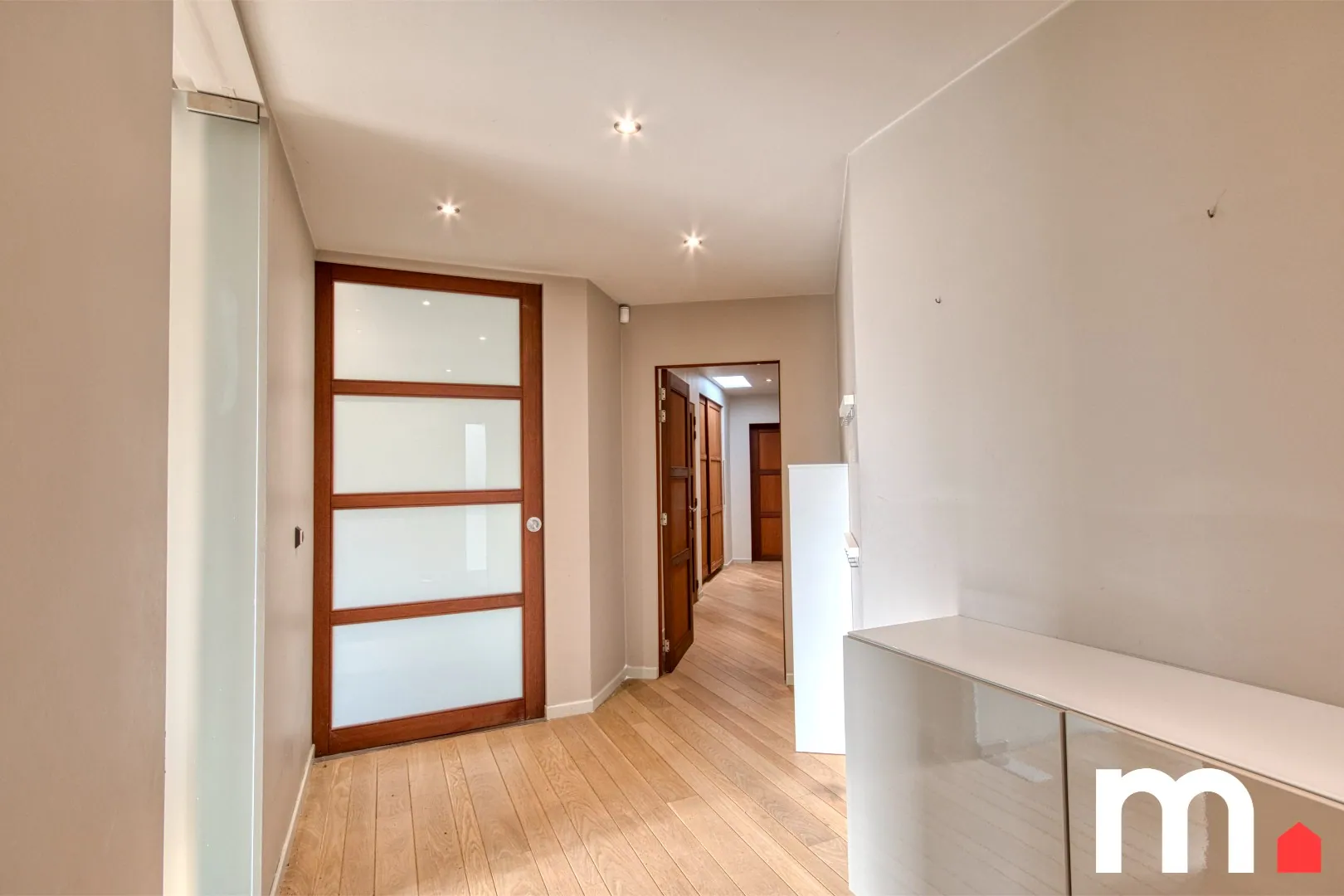 Via een discrete privétoegang kom je aan bij deze uitzonderlijk ruime woning op één niveau — ideaal voor wie wonen en professioneel gebruik op een doordachte manier wil combineren.