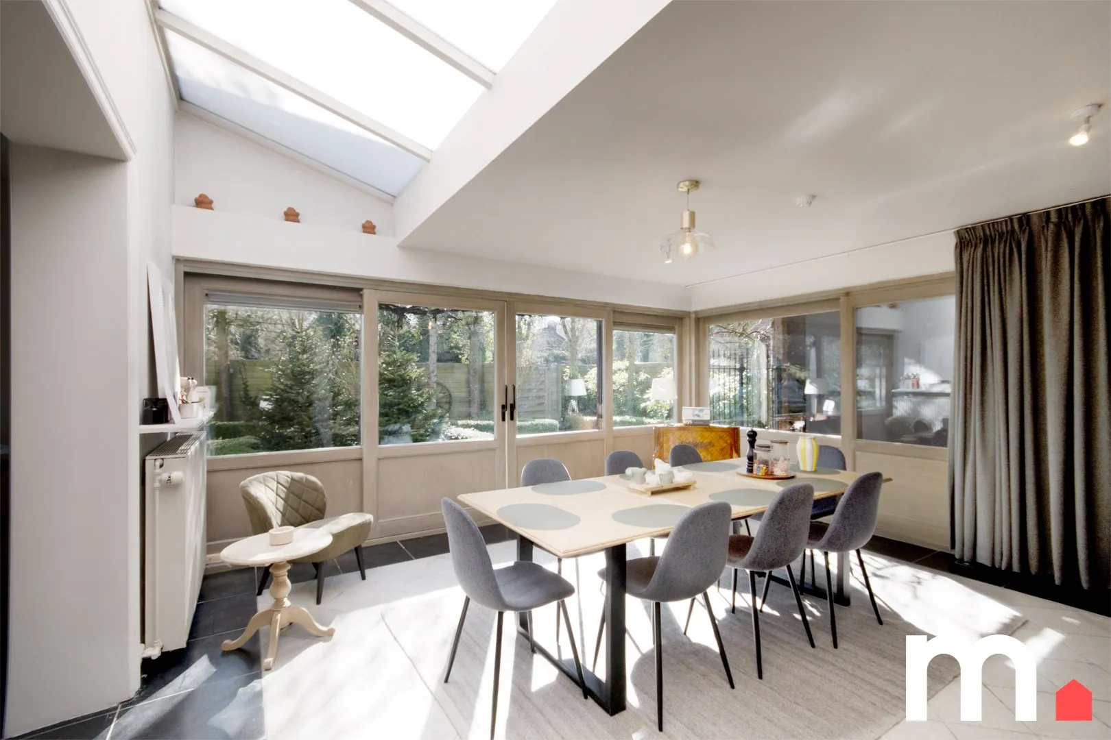 Op heden komt u binnen in de stijlvolle inkomhal met eiken trap. Aansluitend is er de volledige uitgeruste kwalitatieve keuken met koelcel.