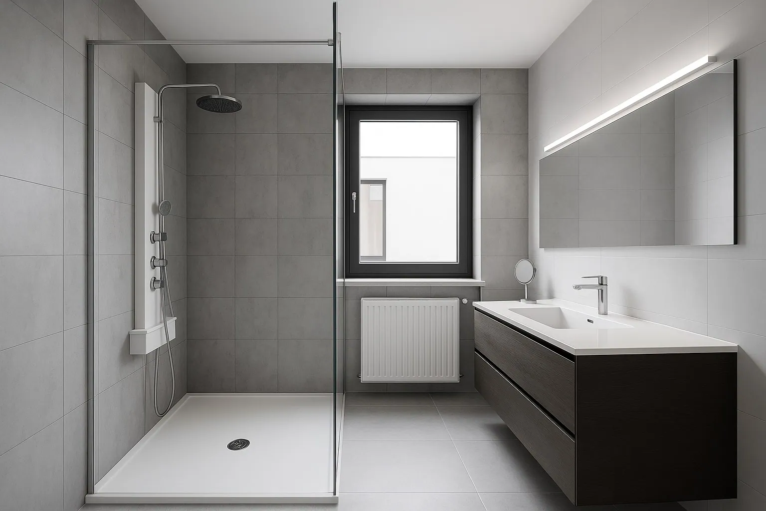 ✅ Badkamer met douche, dubbele lavabo meubel en spiegel