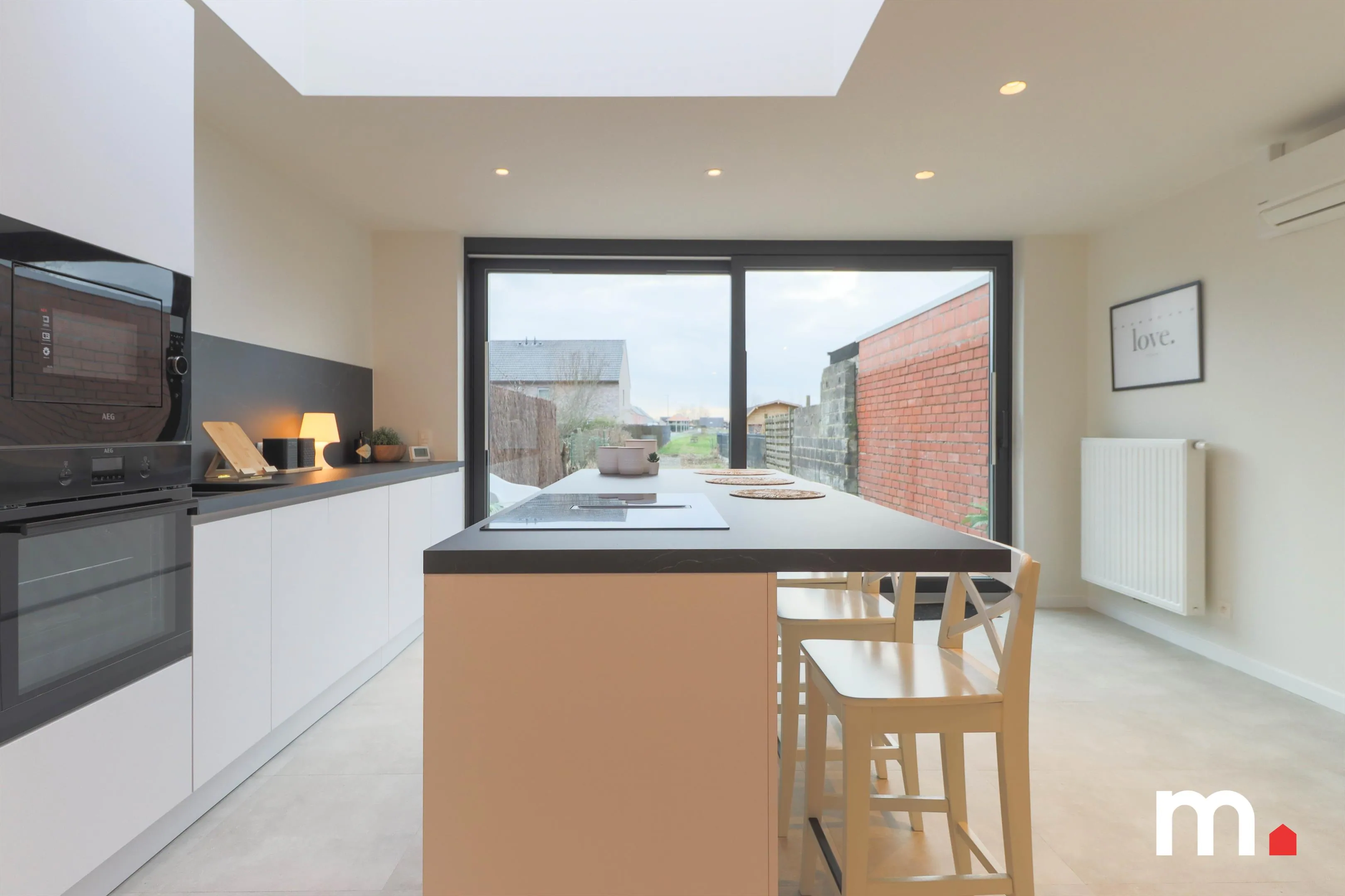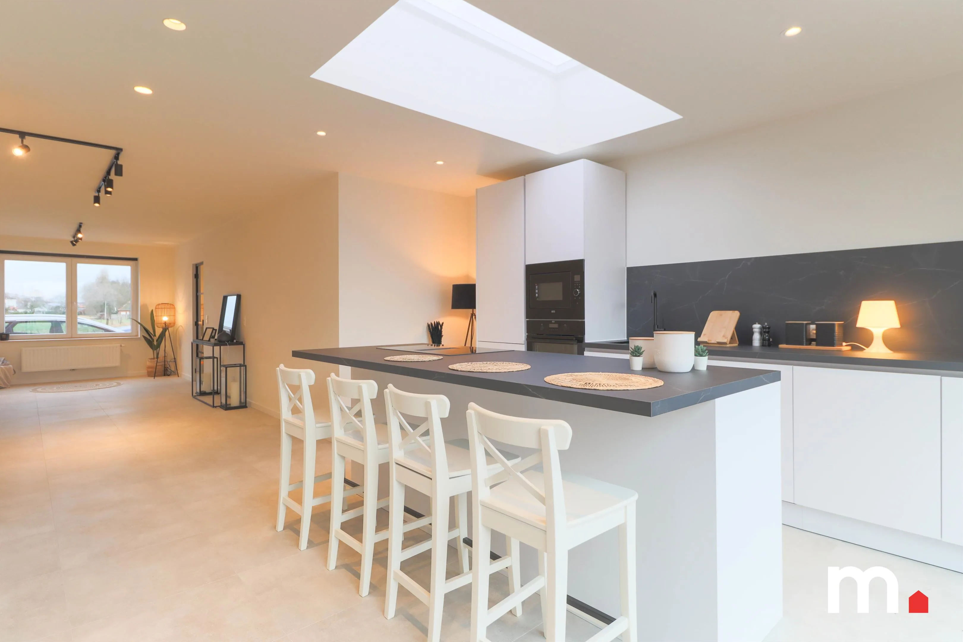 De keuken werd volledig gemoderniseerd en kreeg een strakke inrichting. Een lichtkoepel werd geïnstalleerd om natuurlijk licht naar binnen te laten stromen, waardoor een heldere en uitnodigende sfeer ontstond. Een eiland werd toegevoegd, dat niet alleen als kookeiland fungeert, maar tevens als eettafel dient, waardoor een gezellige en praktische ruimte ontstaat die ideaal is voor zowel koken als dineren.