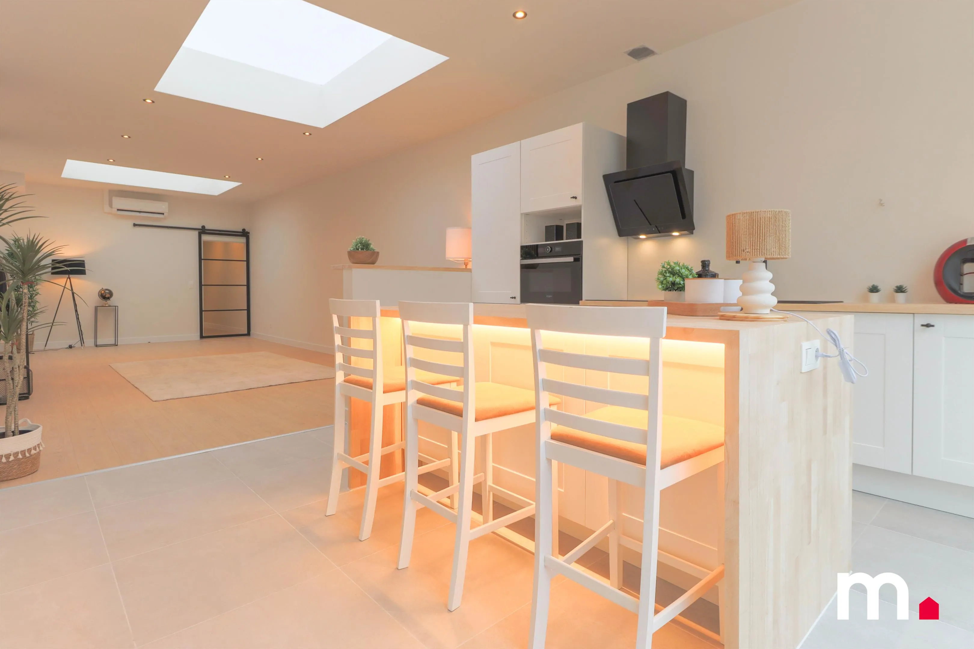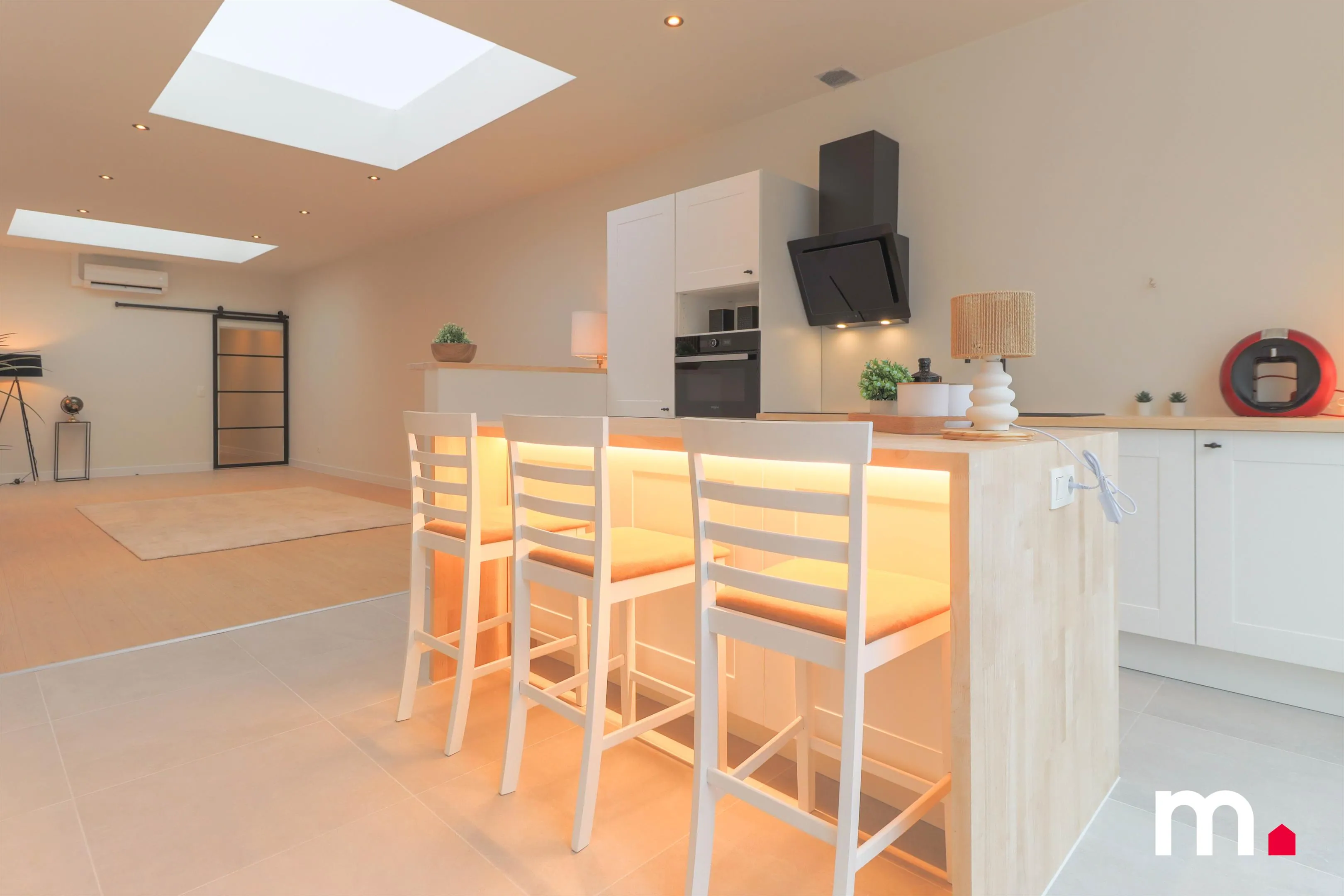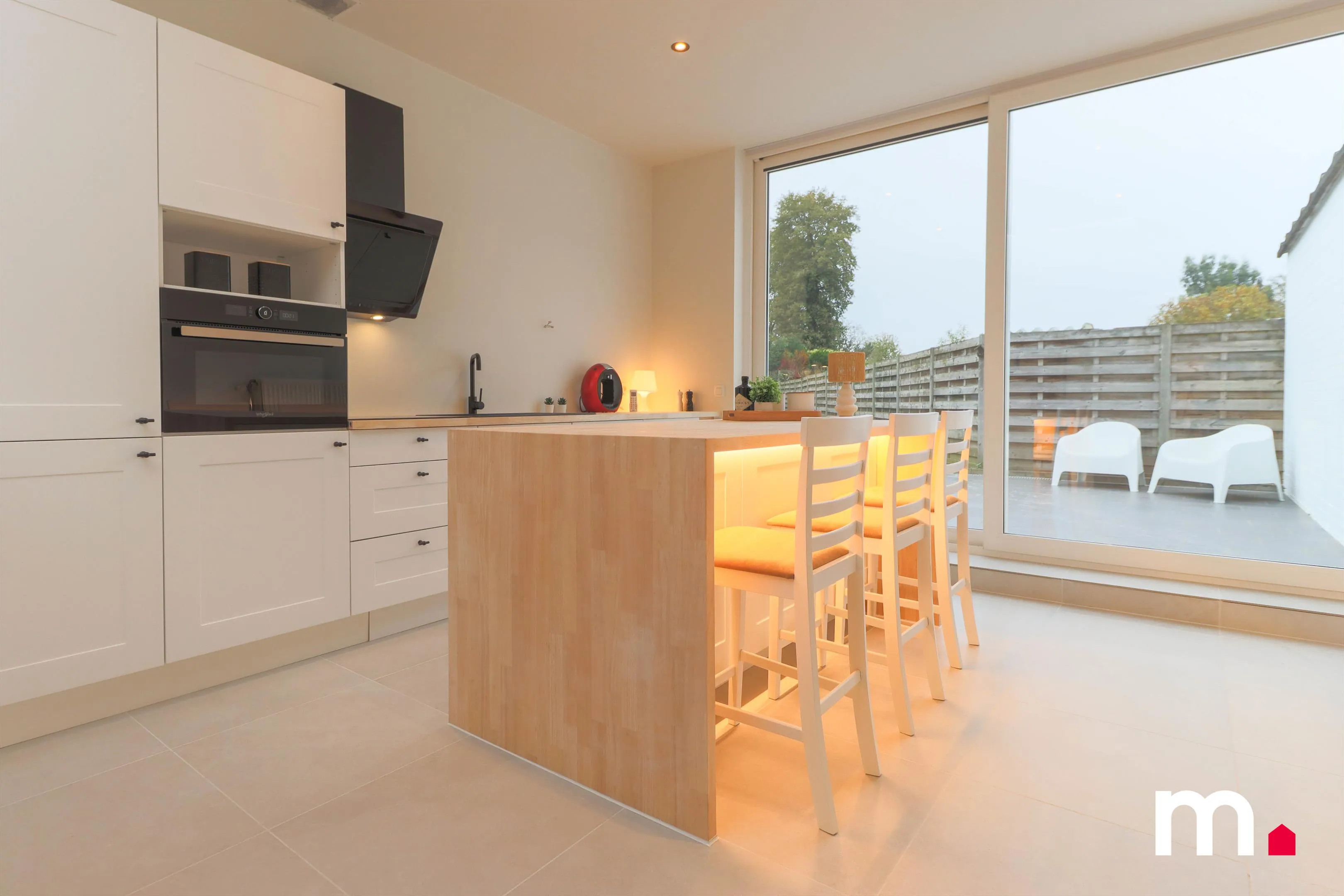 Deze woning, ooit een verouderde en vervallen woonst met een stijl die zijn beste tijd gehad had, is door een grondige renovatie omgetoverd tot een moderne en uiterst energiezuinige thuis. Waar vroeger een bouwvallige keuken stond, is nu een volledig uitgeruste, moderne keuken geïnstalleerd met hoogwaardige toestellen. Deze nieuwe keuken beschikt over een combi-oven, een koelkast met diepvries, een vaatwasmachine en een inductiekookplaat. Het centraal geplaatste keukeneiland vormt het hart van de ruimte en biedt een praktische en gezellige plek om te koken en samen te komen.