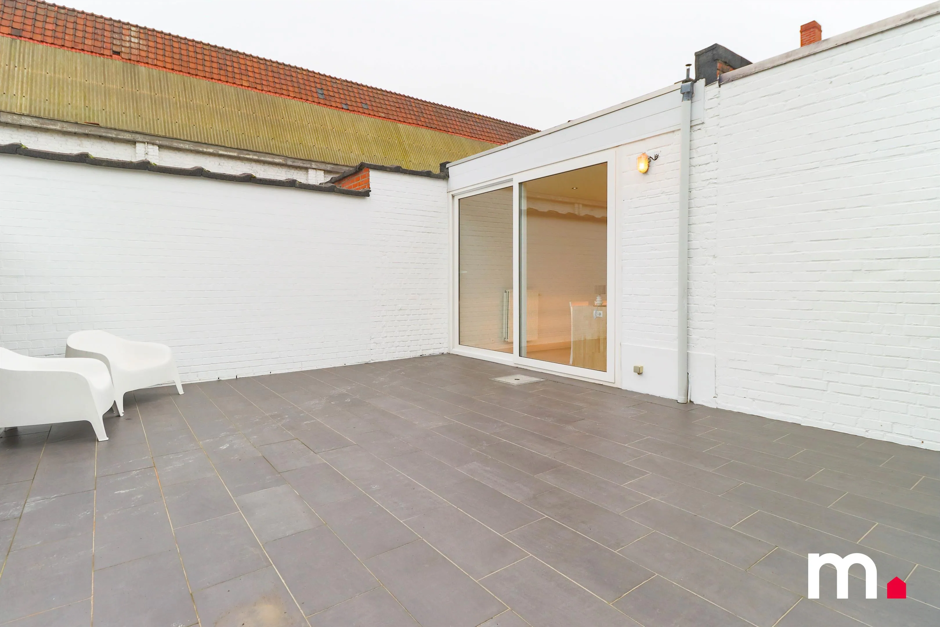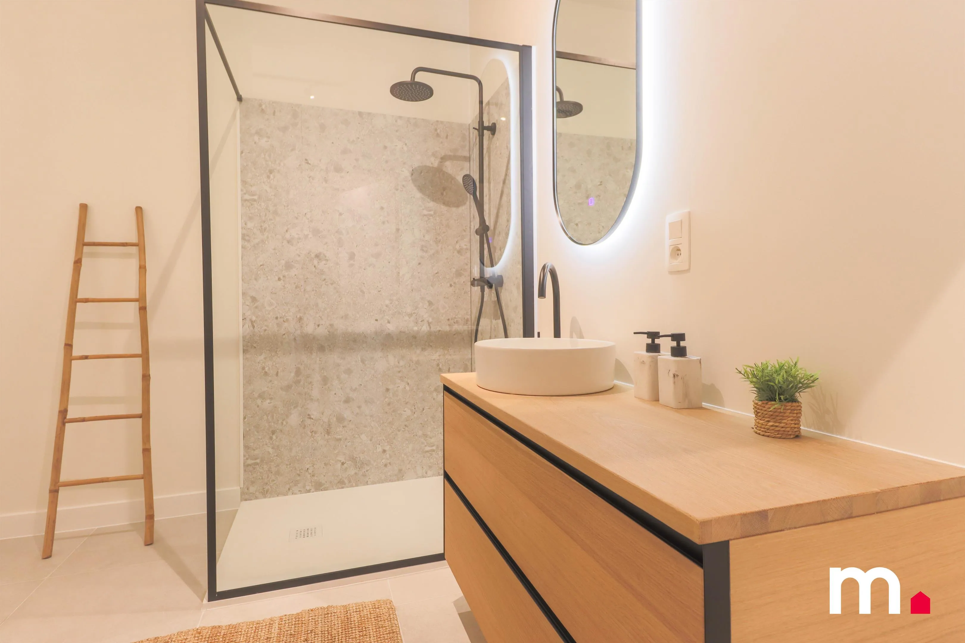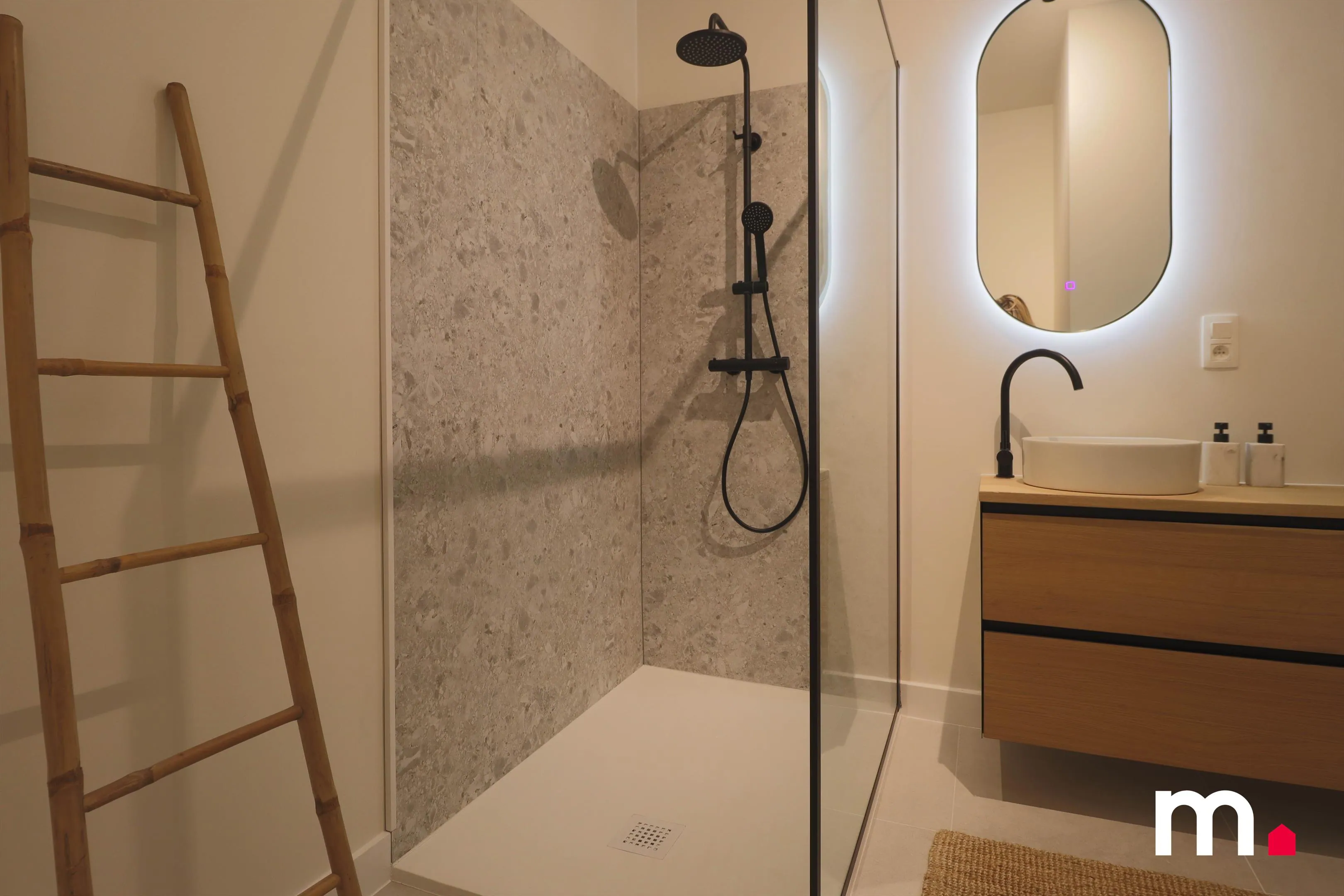 De badkamer, die oorspronkelijk nauwelijks voorzien was van de basisuitrusting, is volledig vernieuwd. Ze is uitgerust met een ruime inloopdouche, een lavabo met een verlichte spiegel, en aansluitingen voor wasmachine en droogkast. Ook de nieuwe, energie-efficiënte gascondensatieketel heeft hier een plaats gekregen.