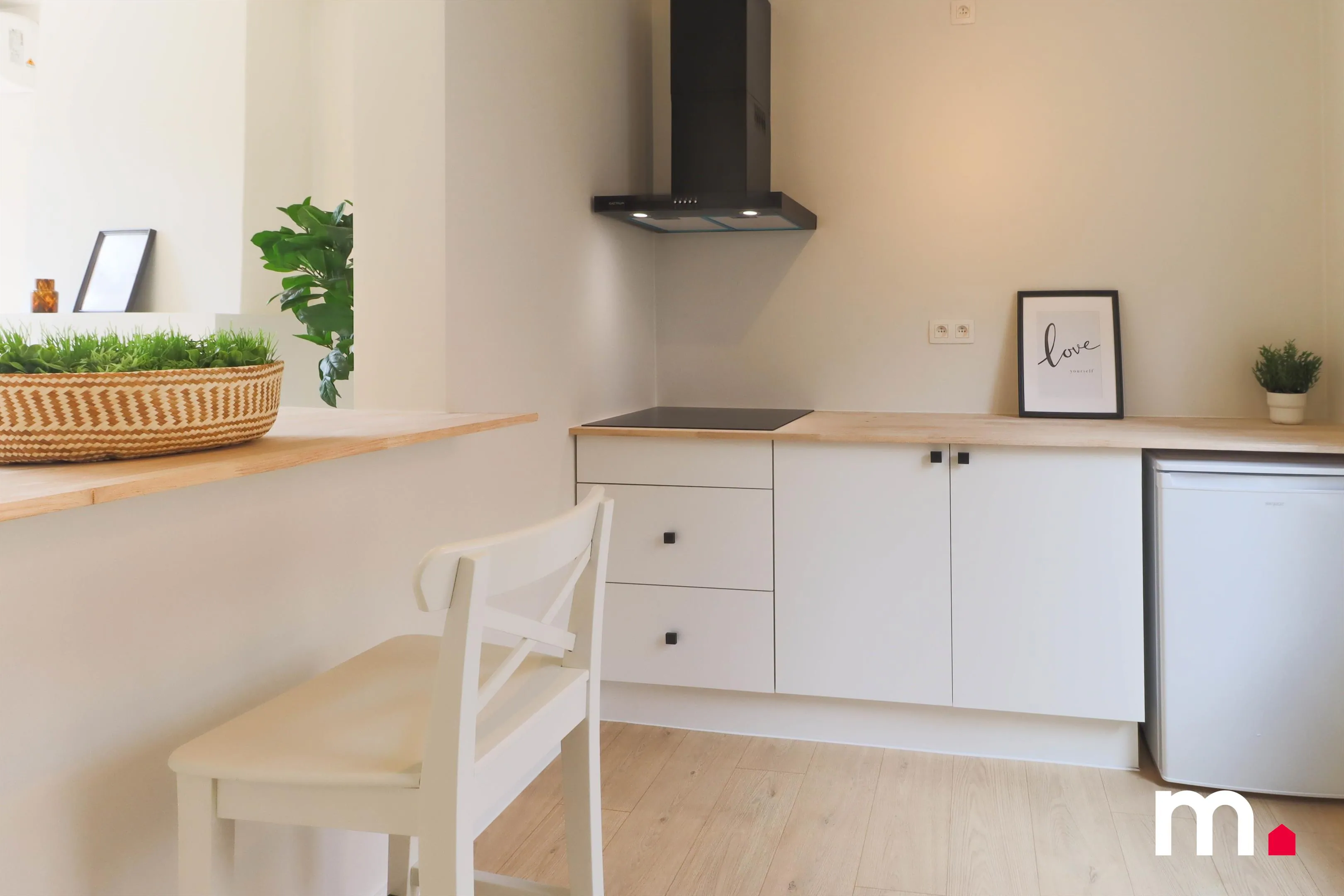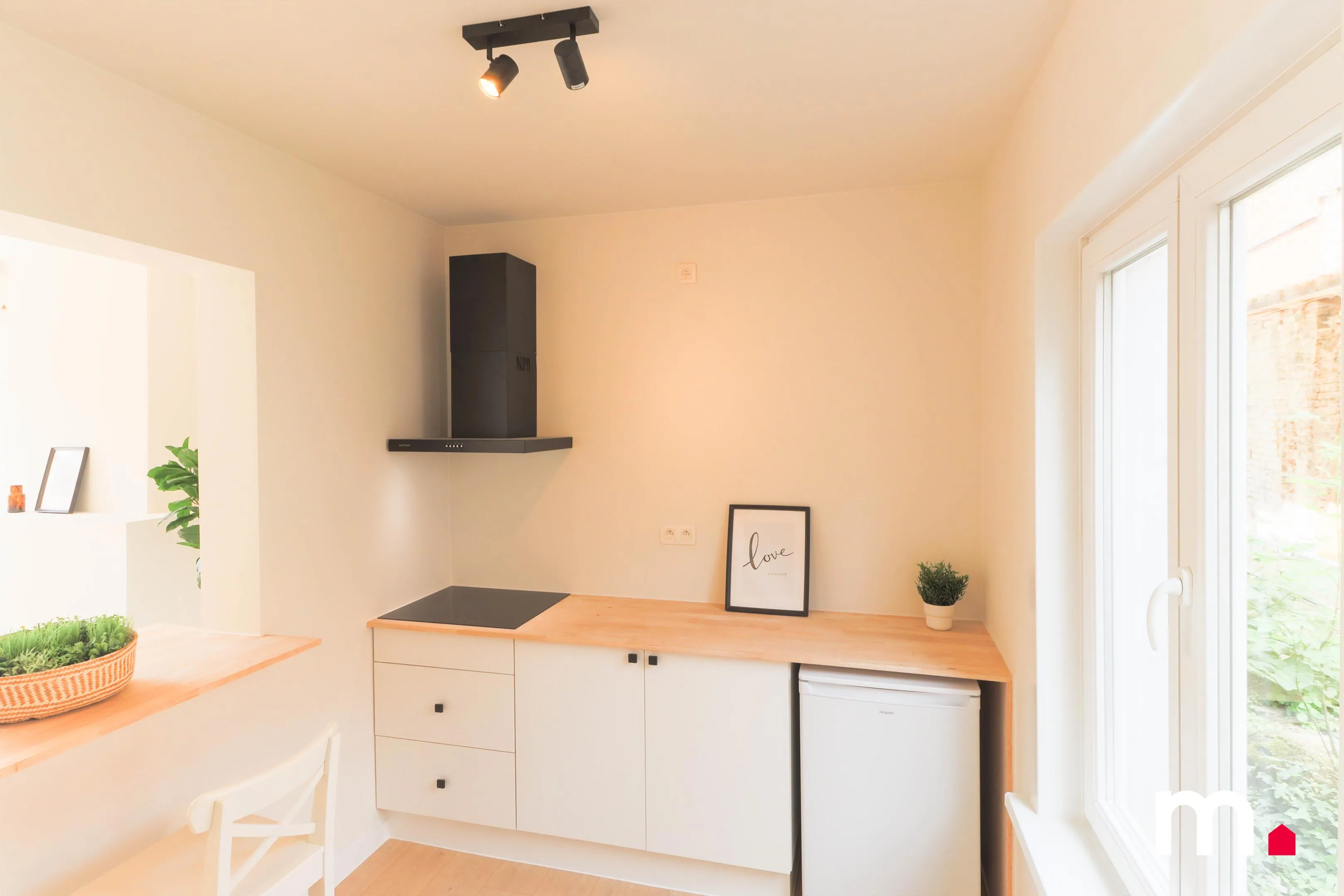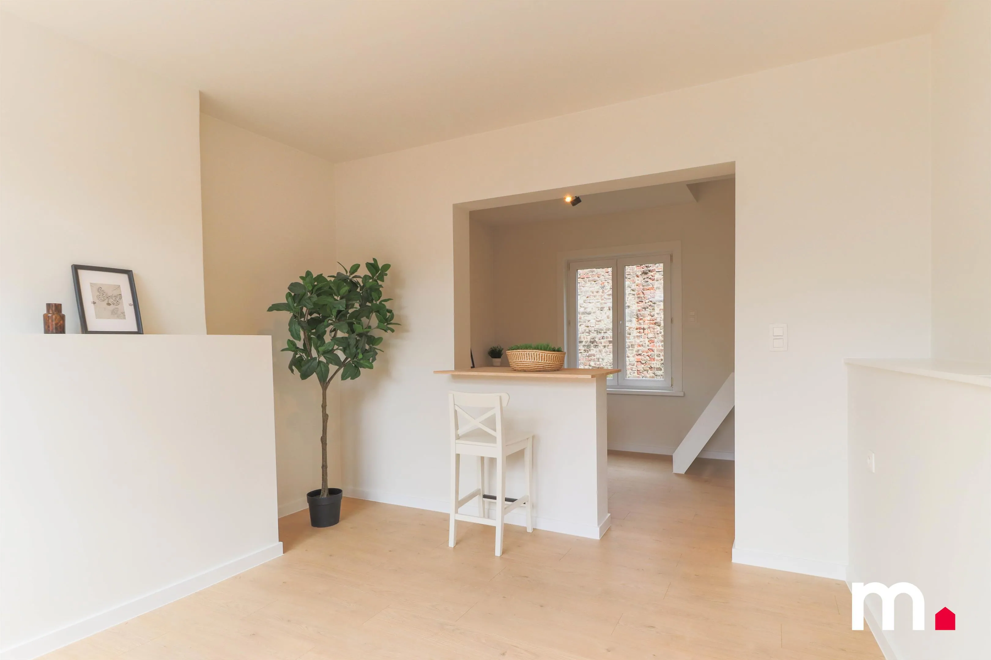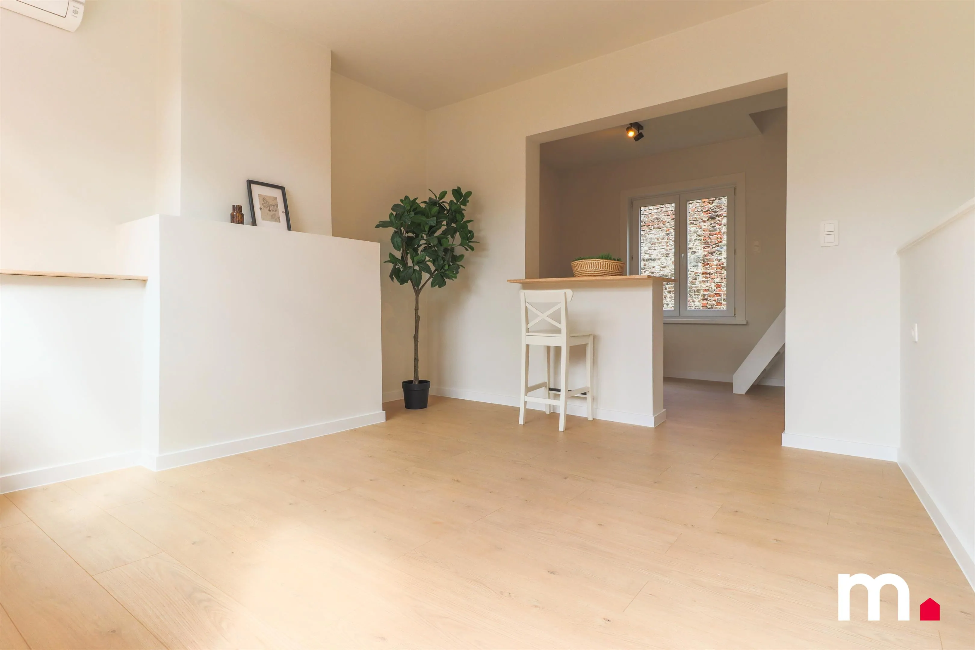 De zeer lichtrijke leefruimte met open keuken valt onmiddellijk op. Deze ruimte, die voorheen donker en beklemmend was, straalt nu dankzij het overvloedige natuurlijke licht en de doordachte materiaalkeuzes. De open keuken is volledig vernieuwd en vormt het hart van de woning, ideaal voor gezellige avonden en culinaire avonturen.