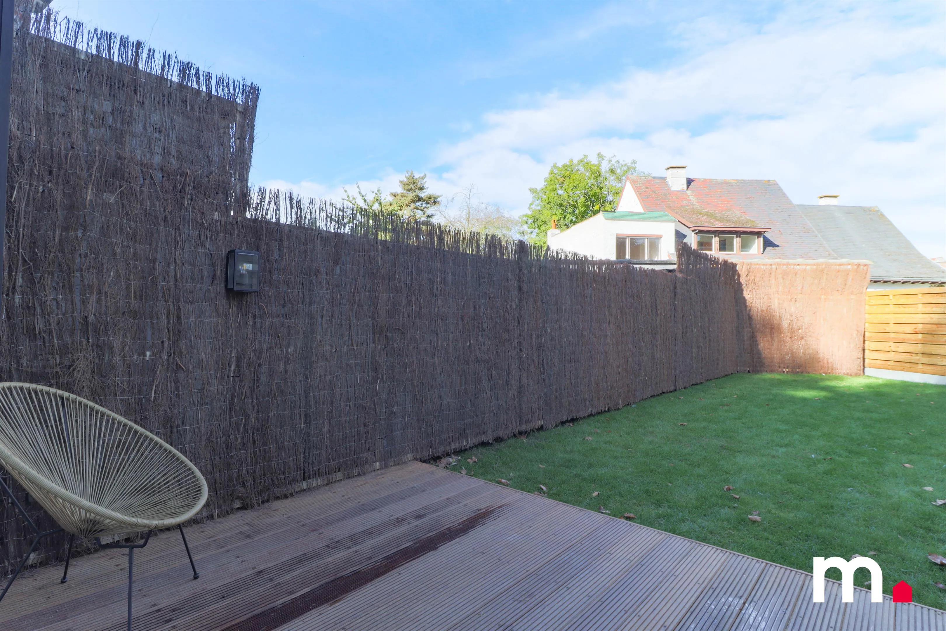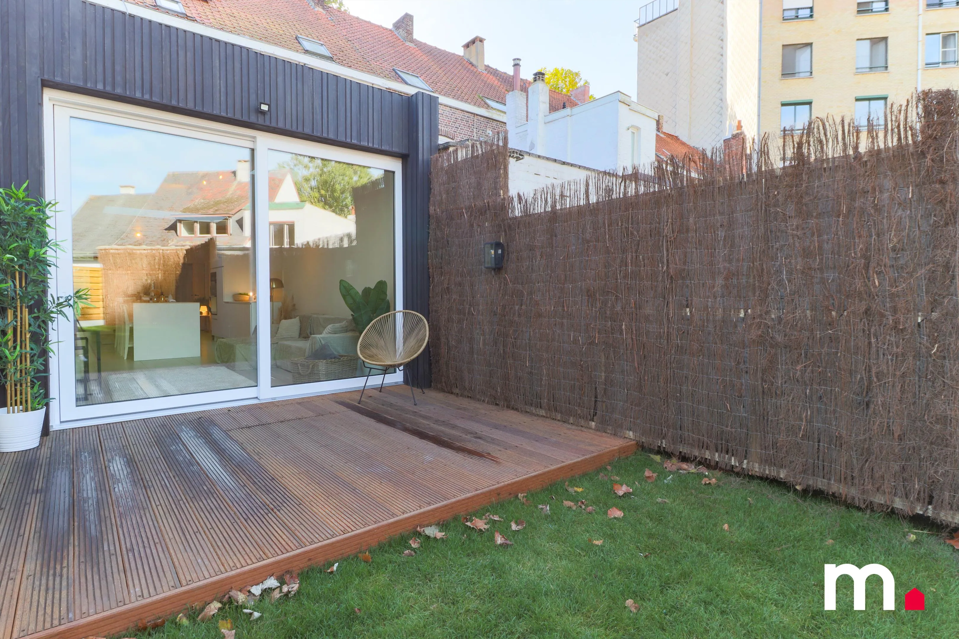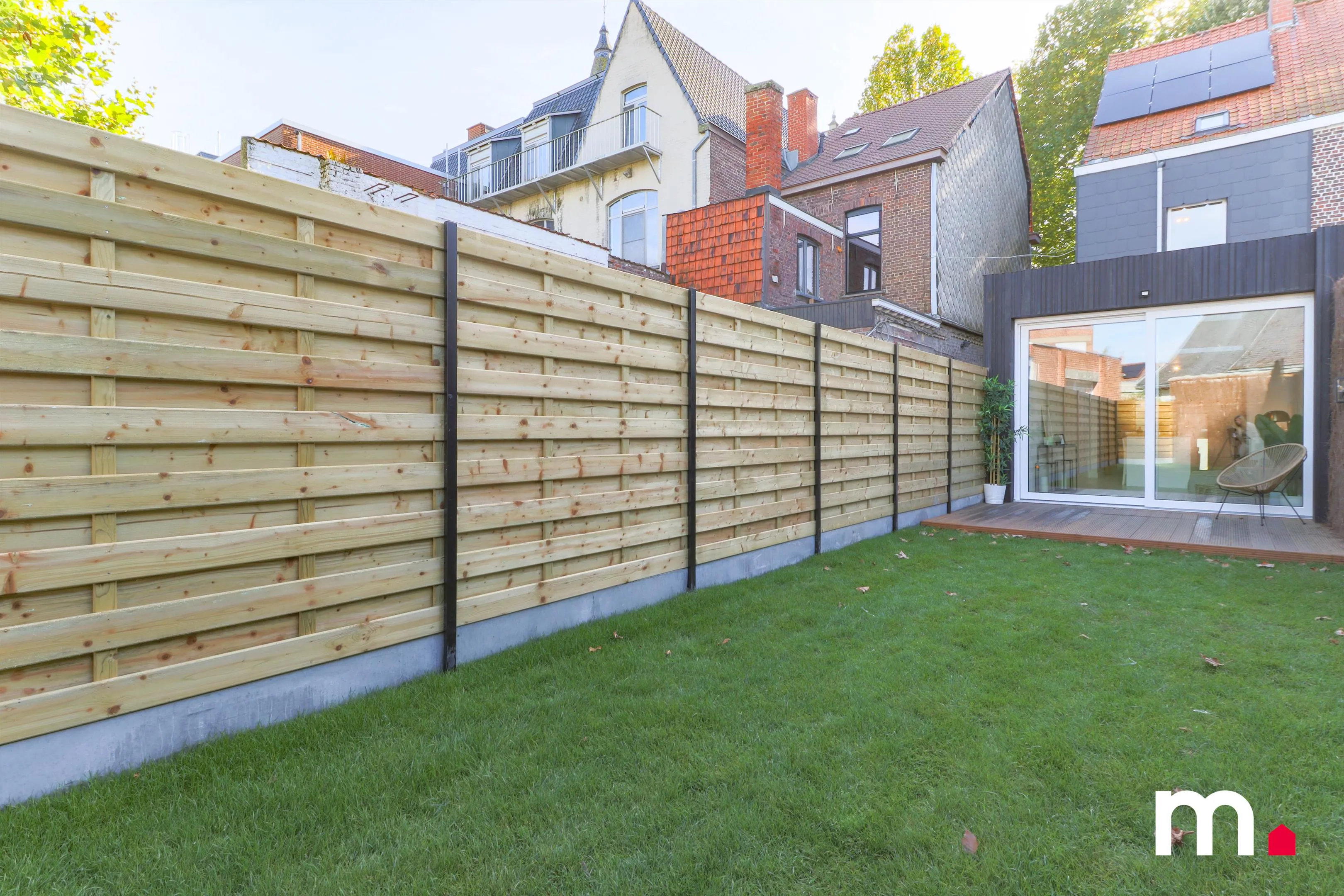 De woning heeft een prachtig aangelegde tuin die zowel privacy als stijl uitstraalt, omringd door een solide omheining en aangelegd met grasmatten die uitnodigt tot gezellige zomerdagen, waardoor een rustig plekje in het hart van de stad gecreëerd wordt.