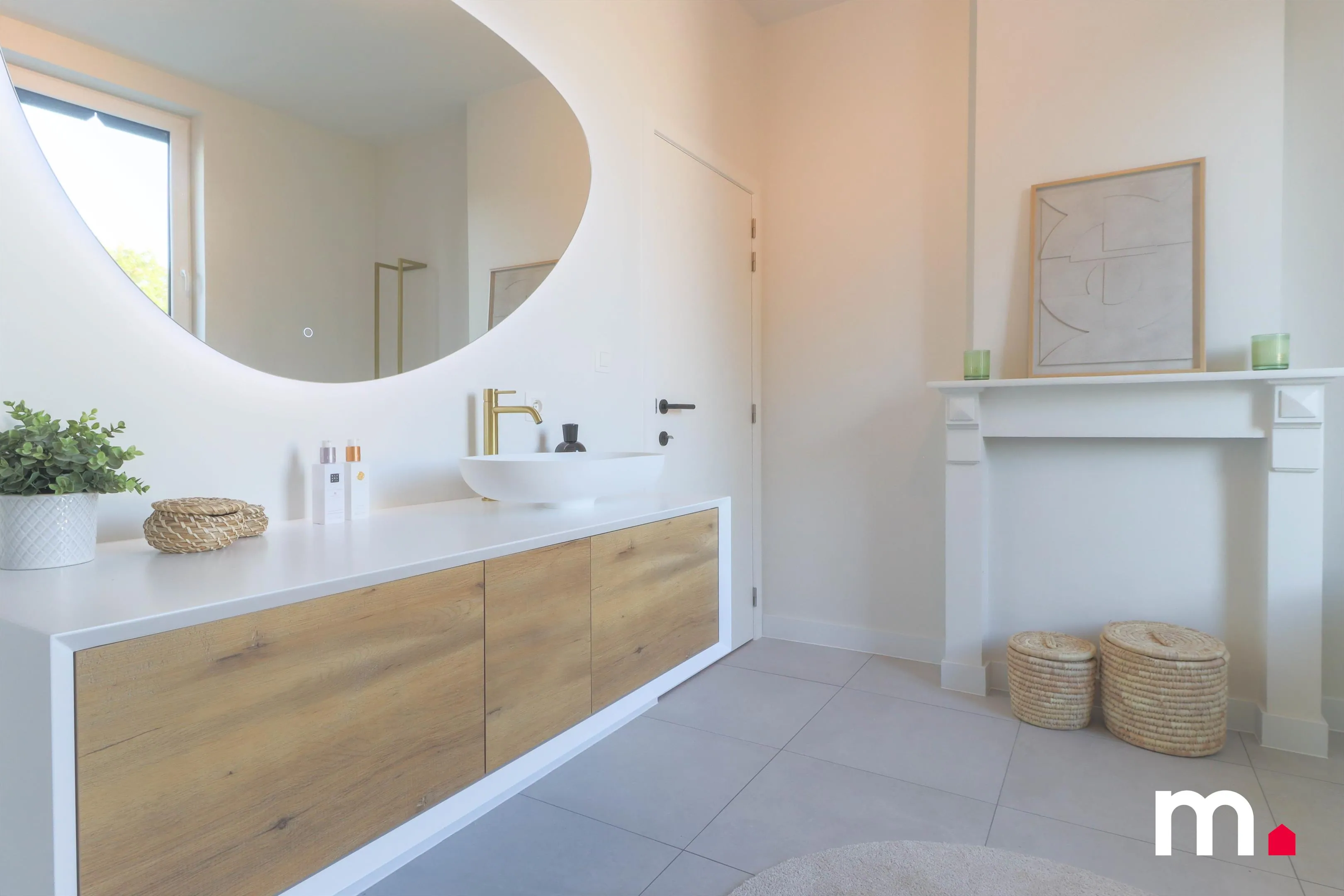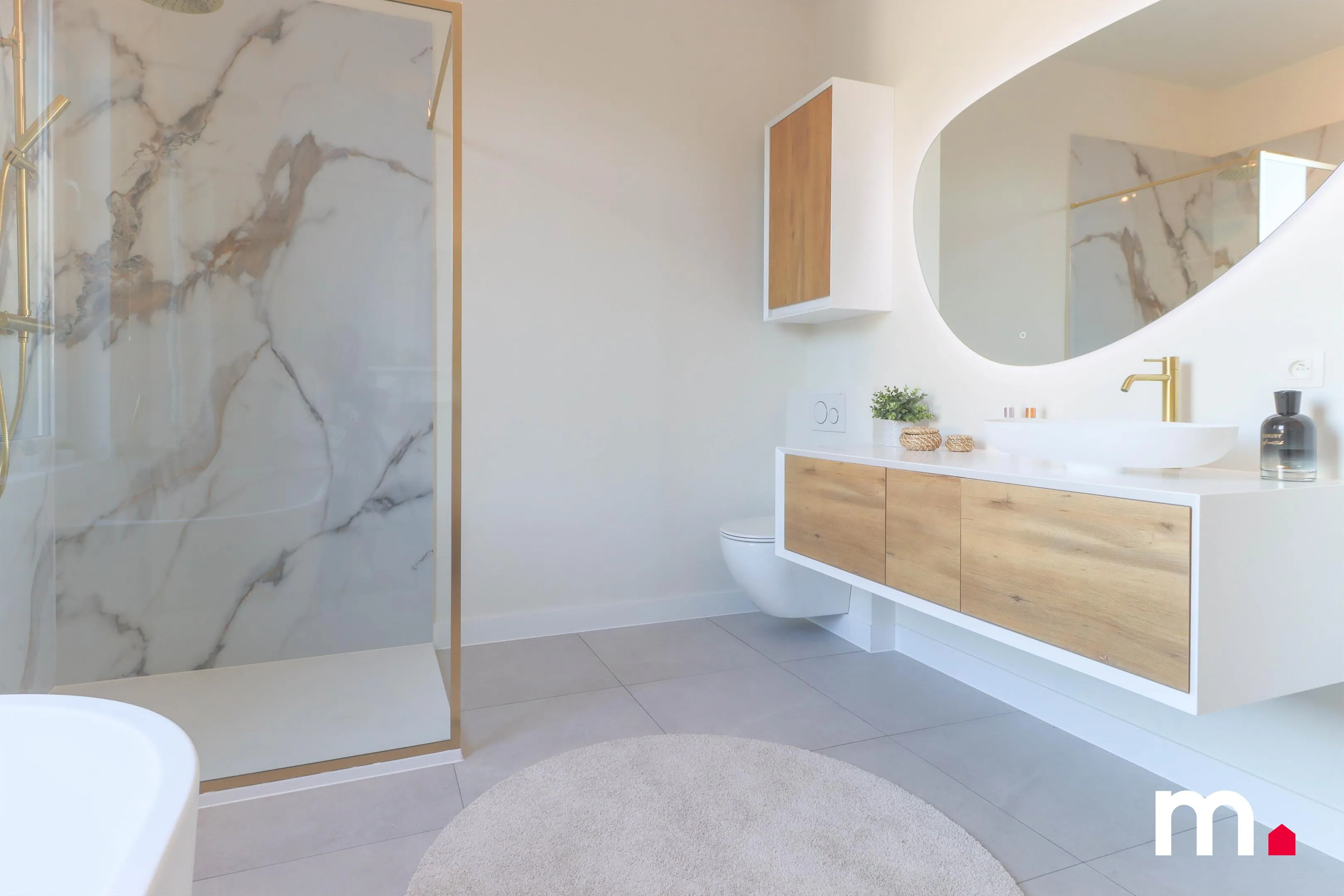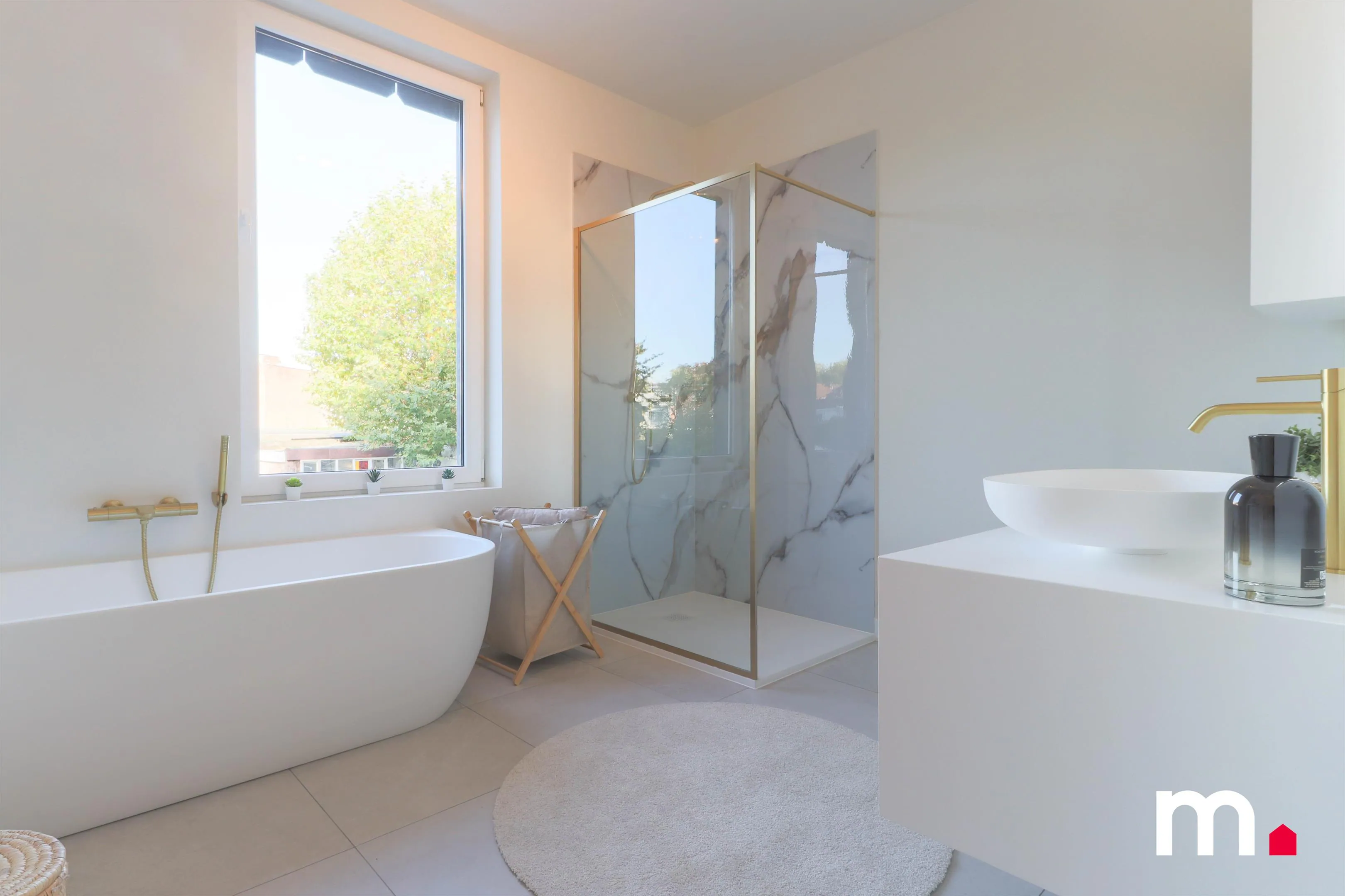 De badkamer werd volledig uitgebroken en vervangen door een stijlvolle inloopdouche met marmeraccenten, modern ligbad en gouden kranen.