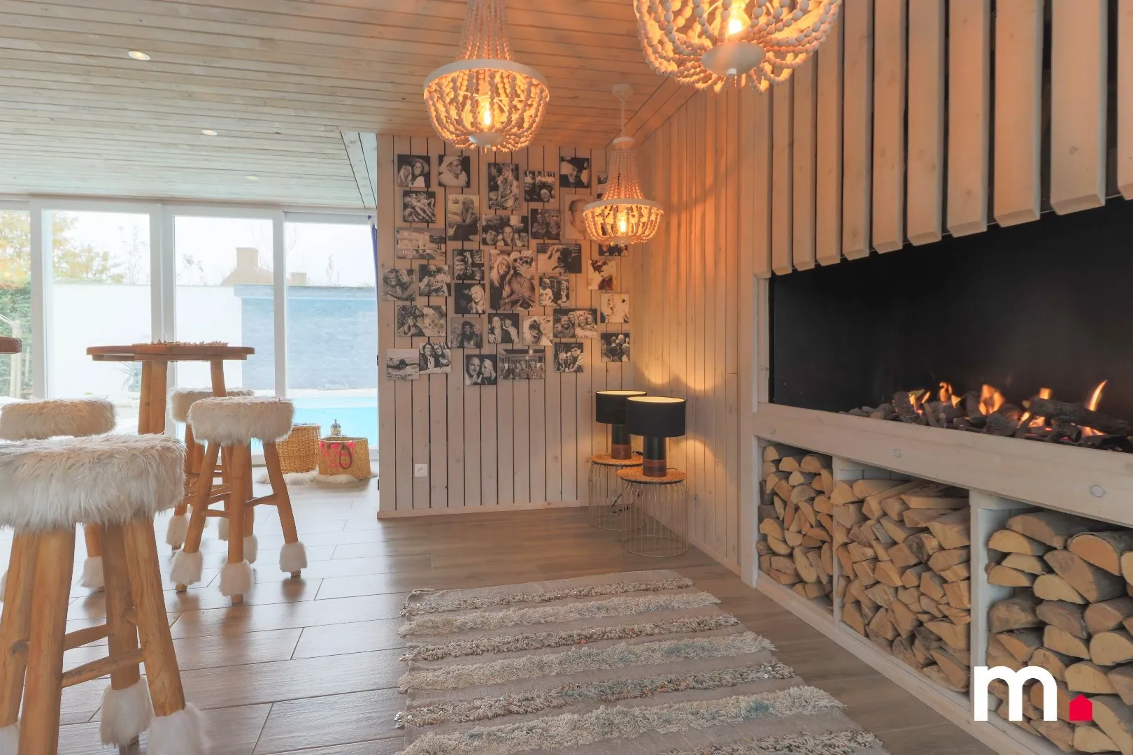 Op het gelijkvloers hebben we een zeer gezellig leefruimte met gashaard en aansluitend een super uitgeruste keuken met prachtig gastentafel.