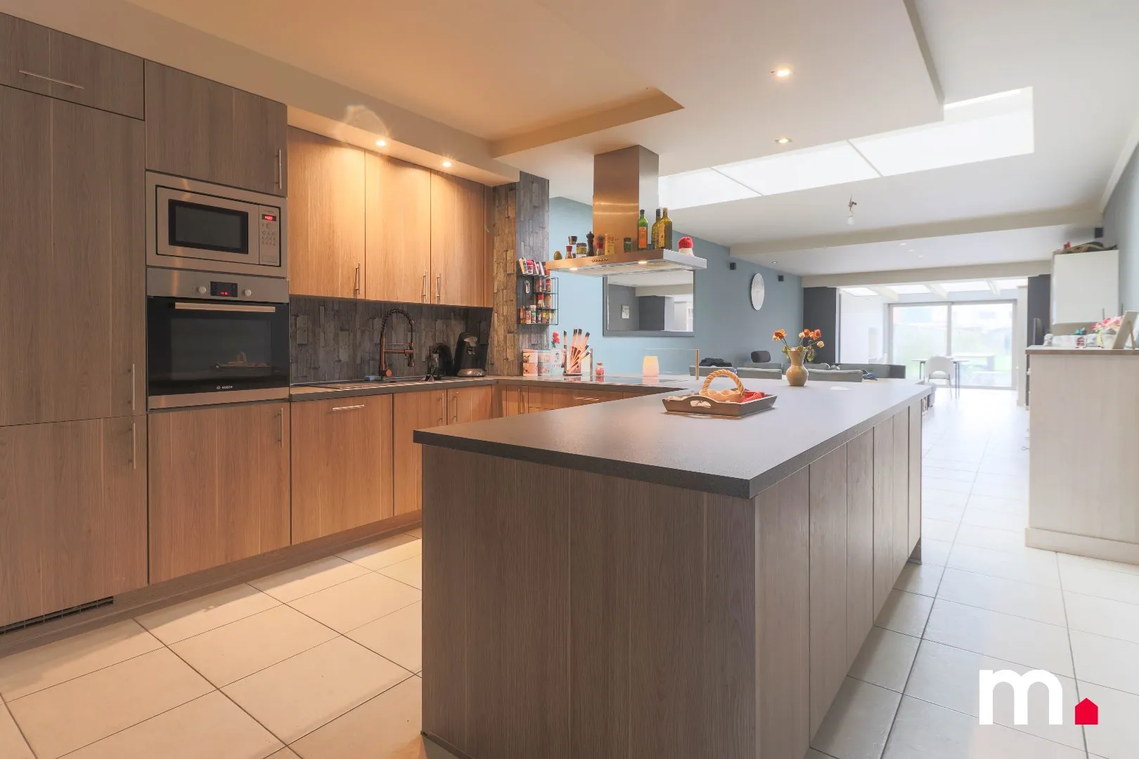 Grenzend aan de keuken vindt u de lichtrijke leefruimte met eetplaats. Dankzij een stijlvolle koepel geniet u hier van een overvloed aan natuurlijk licht. De leefruimte is bovendien voorzien van talrijke inbouwkasten, die niet alleen opslagruimte bieden, maar ook de wasmachine en droogkast op een slimme manier verbergen, wat voor extra ruimte zorgt. Aan de leefruimte grenst een volledig vernieuwde veranda, eveneens uitgerust met inbouwkasten en een inbouwkast/wand, die een overgang biedt naar de buitenruimte.