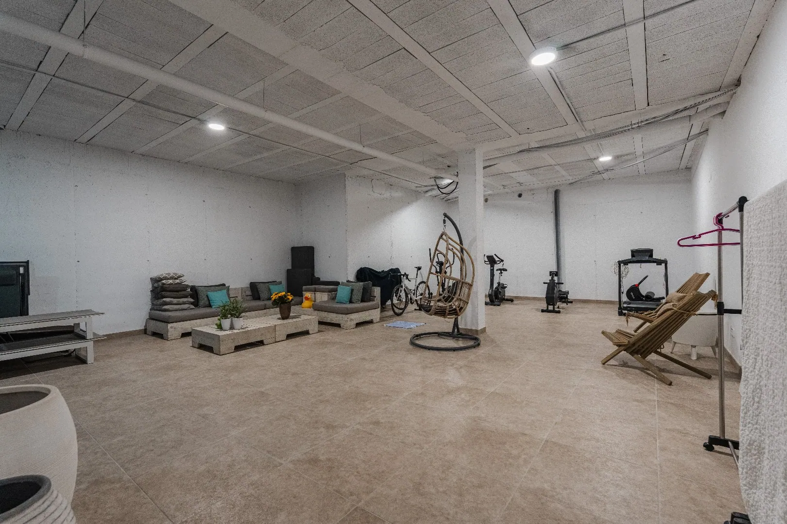 Onder de woning bevindt zich een volledig ingericht gastenappartement met twee slaapkamers, ideaal voor het ontvangen van vrienden of familie, of als zelfstandige leefruimte. Daarnaast is er op dit niveau een grote multifunctionele recreatieruimte, die momenteel deels wordt gebruikt als opslagruimte en fitnesszone. Deze ruimte biedt tal van mogelijkheden en kan eenvoudig worden ingericht als hobbyruimte, home cinema of extra ontspanningsruimte, volledig naar eigen wens.