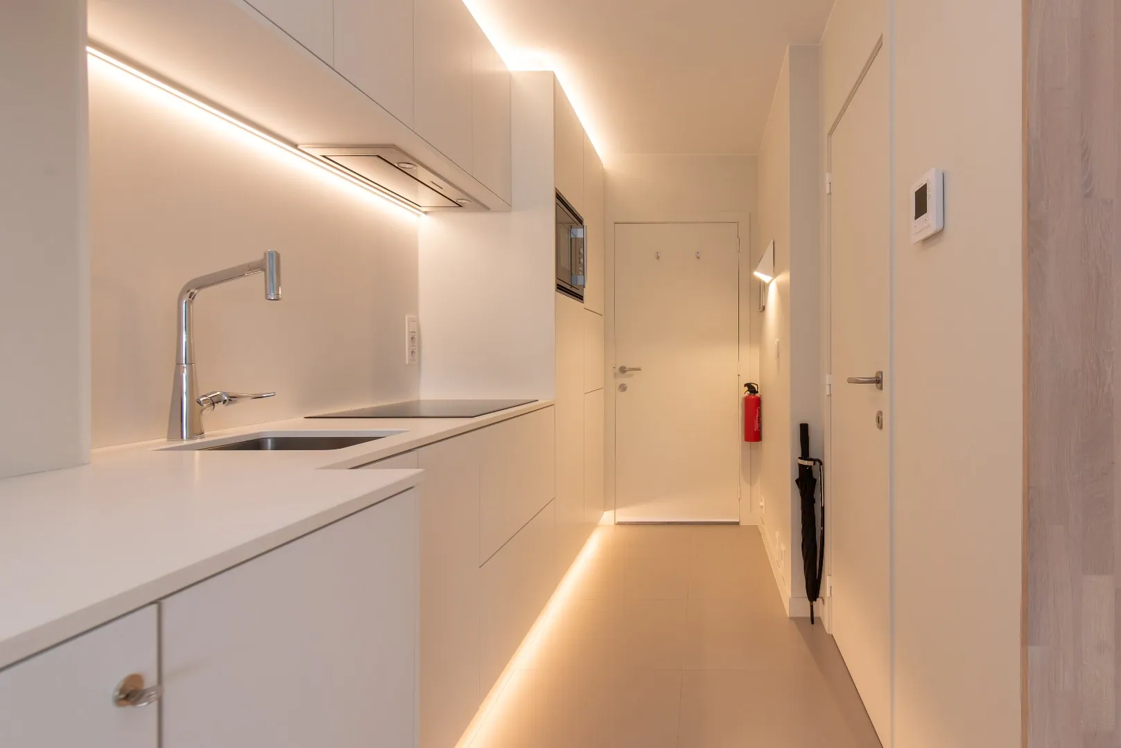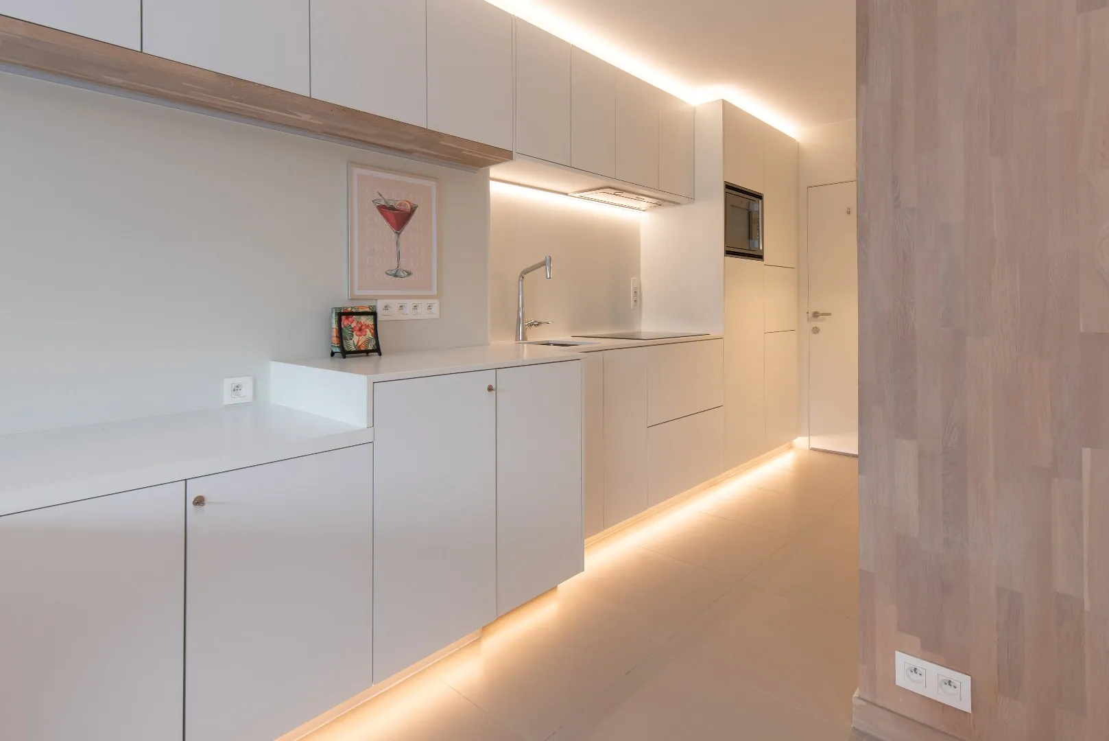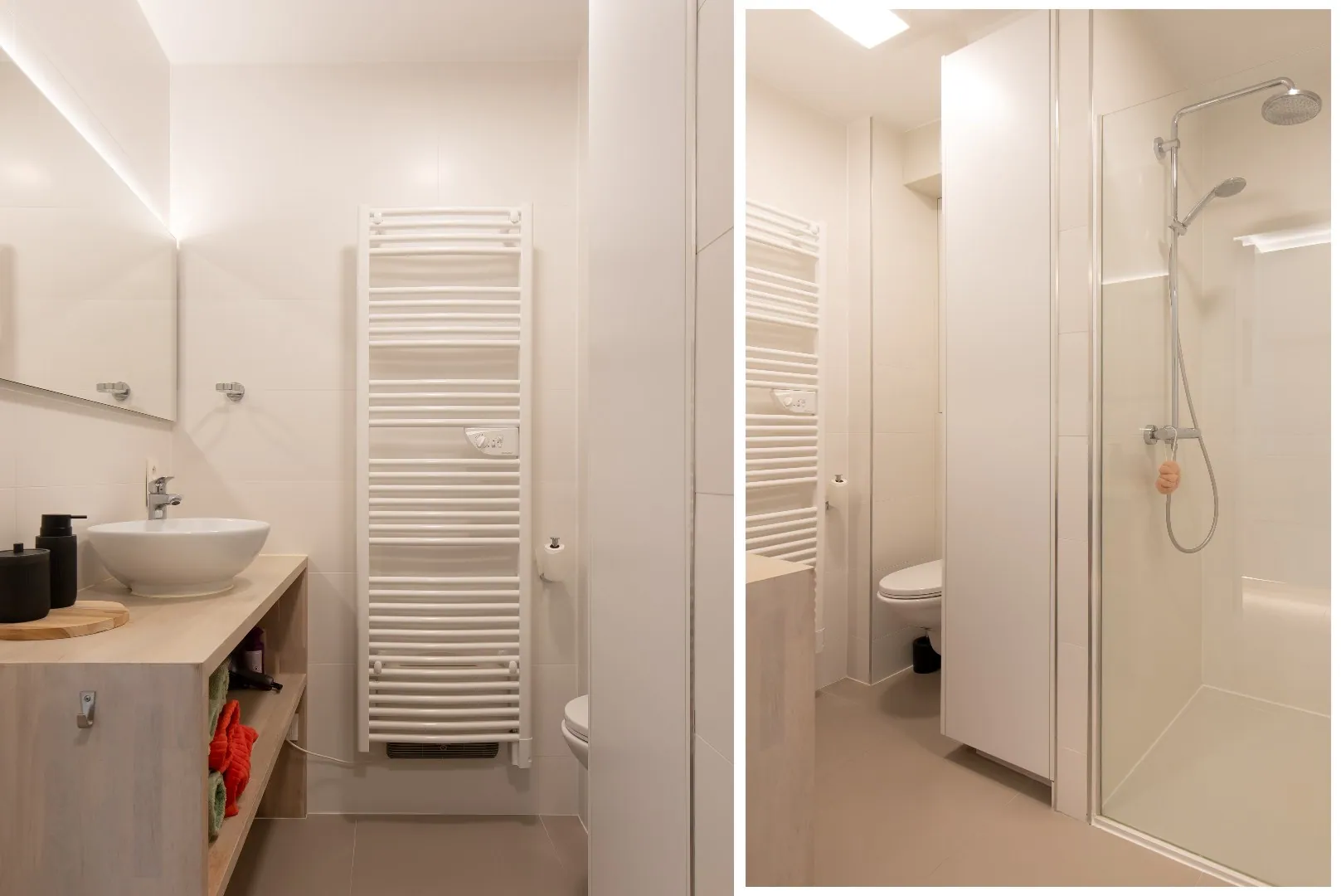 De studio omvat een badkamer met inloopdouche en wc, een op maat gemaakte keuken met AEG toetellen, leefruimte met opklapbed, en er is eveneens een kelderberging inbegrepen.