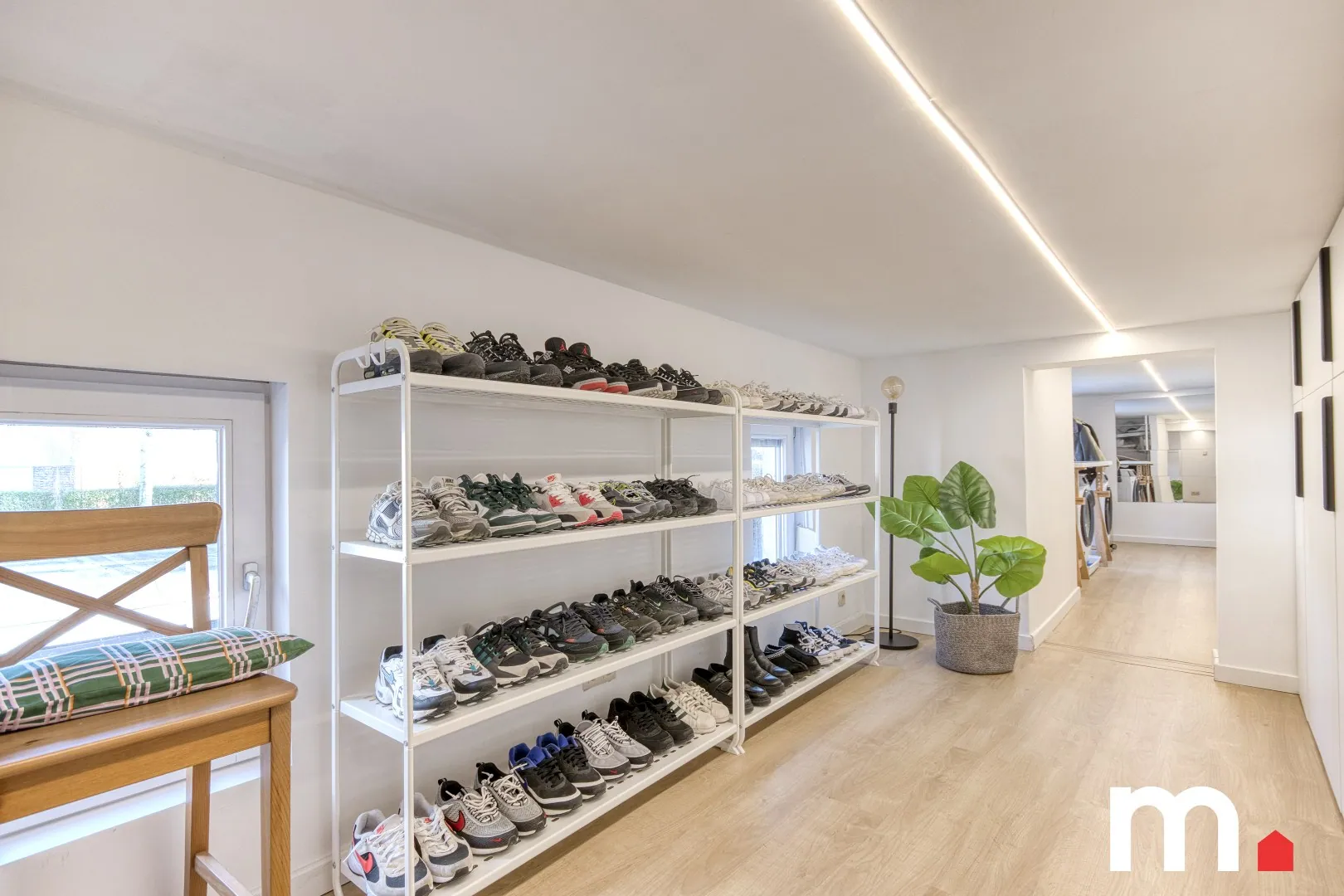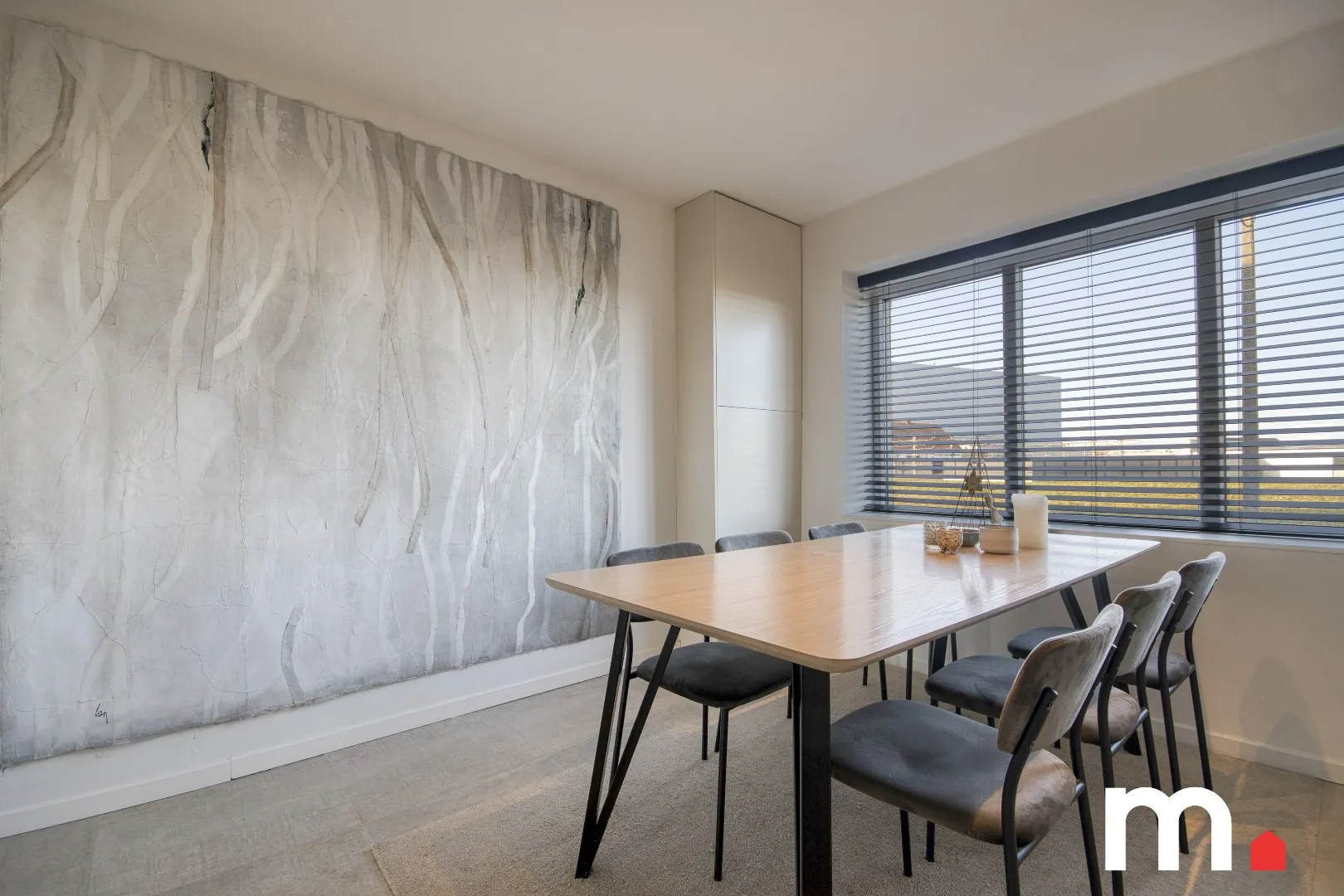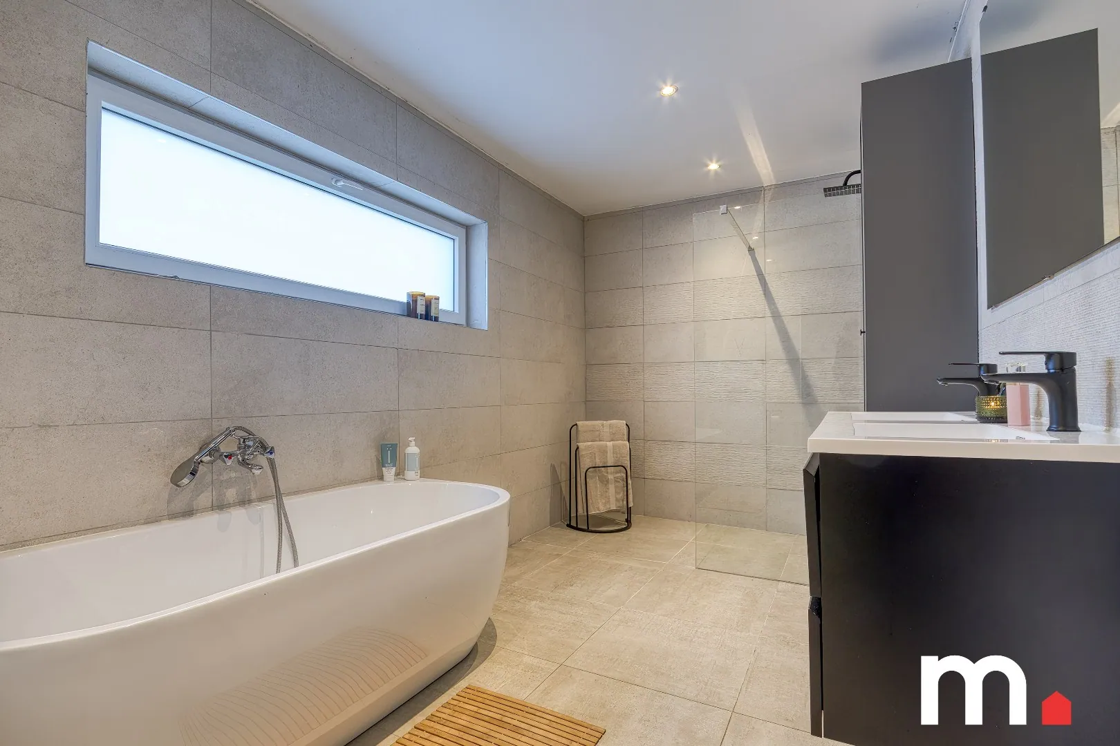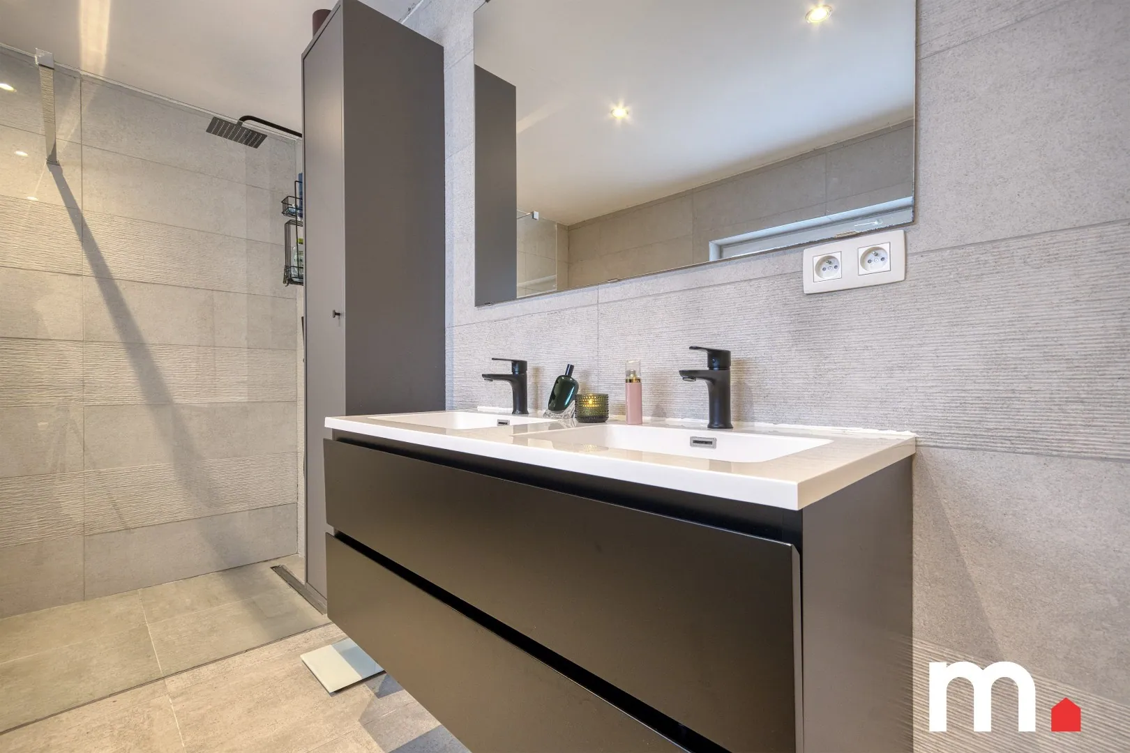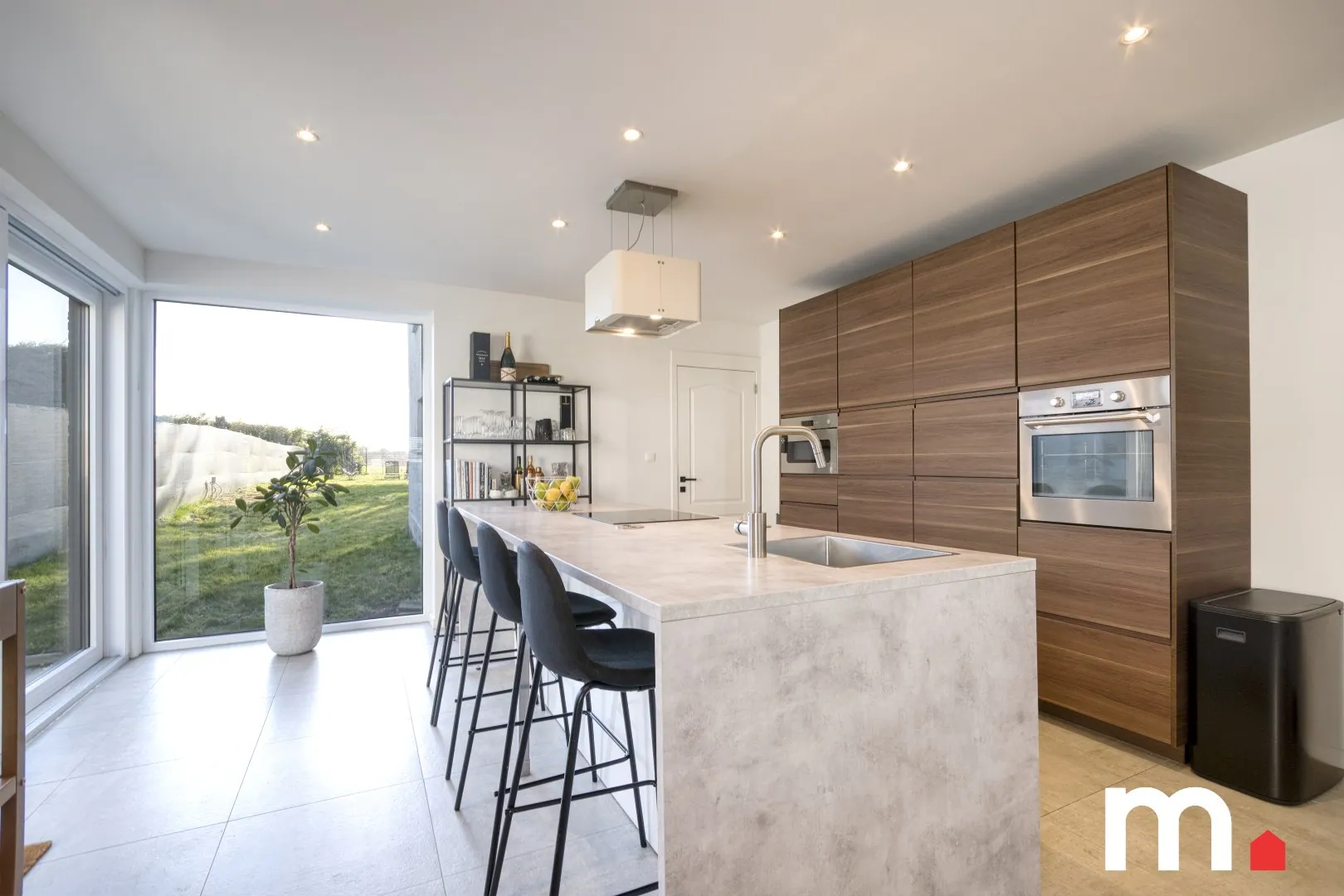 Gelijkvloers: inkomhal, zeer lichtrijke woon- en leefruimte, hyper moderne uitgeruste keuken met kookeiland, zeer ruime badkamer met inloopdouche -ligbad- dubbele wastafel en toilet, en een droge kelder.