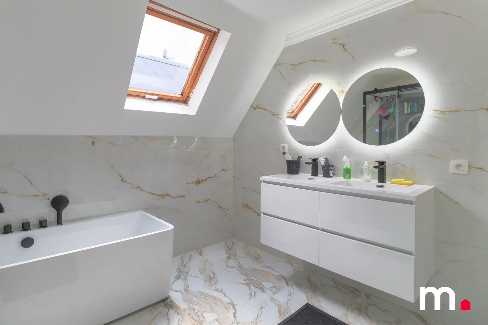Eerste verdieping met tweede luxe badkamer: ligbad, douche, dubbele wastafel, spiegel en tweede toilet
