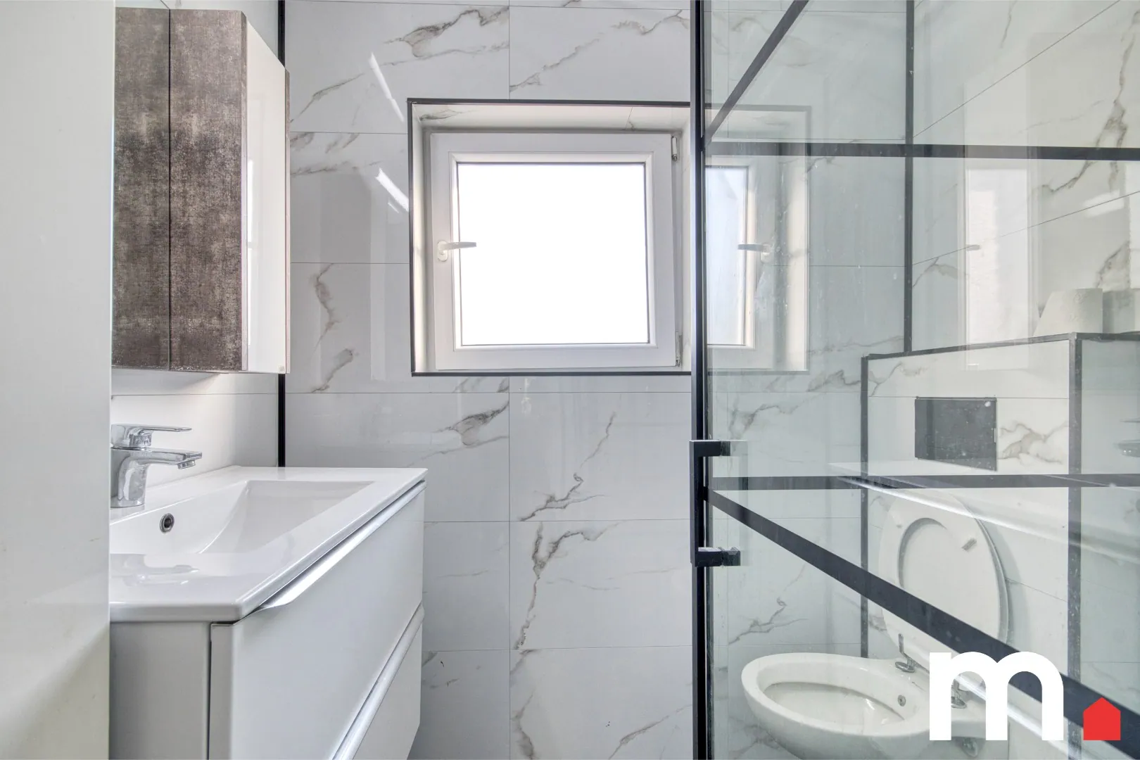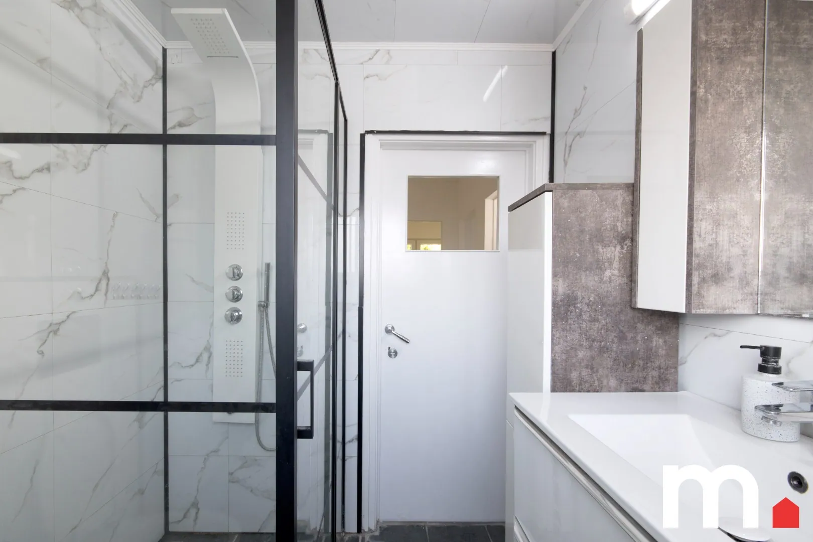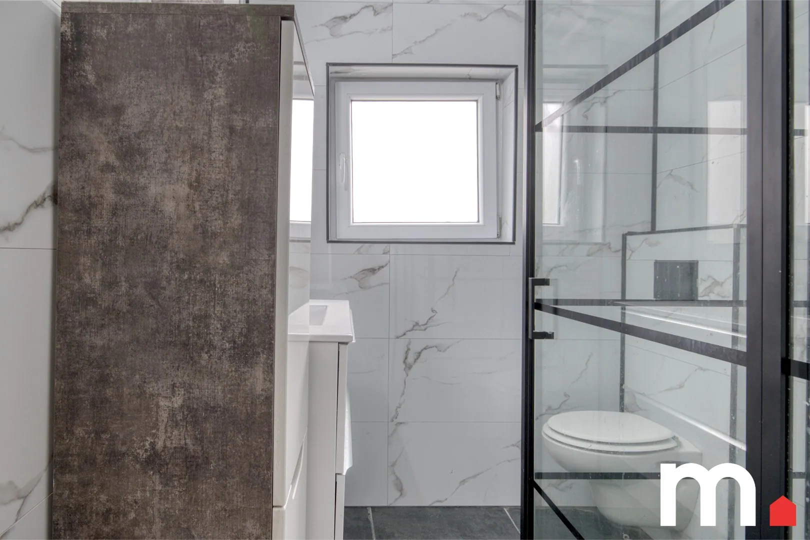 ✅ Badkamer met: inloopdouche, wastafel met meubel en spiegel en toilet