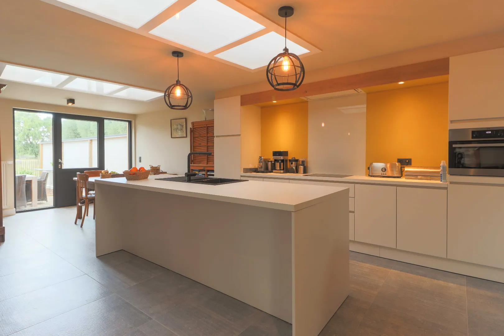 Via de inkomhal komen we terecht in de ruime leefruimte met zicht op de velden. Aansluitende hebben de open keuken met keuken eiland en voorzien van alle nodige keukentoestellen. De grote raampartijen naar de tuin en de 2 lichtstroken in de keuken zorgen voor veel natuurlijke lichtinval. De gezellige tuin is zuidelijk gericht en biedt uitzicht op de natuur.